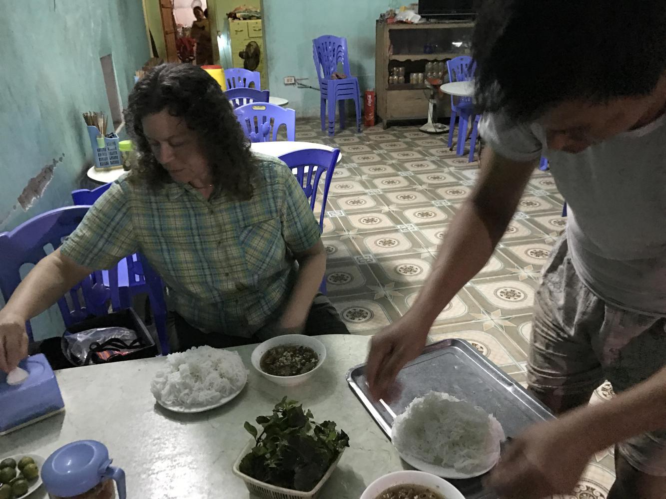 At some point our fellow coffee lollygaggers pointed us in the direction of a Nha Nghi, one of the more dodgy ones we’ve been in but still perfectly fine. There was a tiny restaurant nearby whose owner was wearing the filthiest pair of shorts I’d ever seen in Asia but we aren’t dead yet so apparently his wife was doing the cooking. They were nice people and invited us to sit and drink but our hard, hard beds with the bafflingly-decorated bedding were calling us.