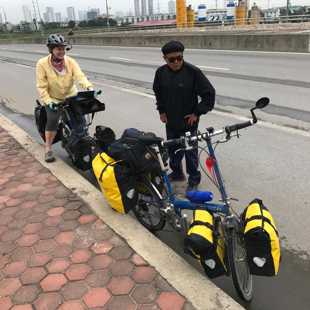 On the big bridge that marks the boundary of Hanoi’s city limits we stopped for a photo. Not ten seconds after we stopped on the middle of the bridge a man on a bicycle stopped and started analyzing every component on our bicycles. He felt the seats, tried the brakes, looked closely at how things worked and even got on. I fully expected him to take a spin right there in the middle of the busy bridge. Andrea and I just looked at each other. I mean, what do you do? He was very serious and of course language was a big issue. He was into bikes! There is a small population, largely older retired men, who are really into bikes. Ours were so unusual that he was super curious as to how they functioned. It was just another example of what we have come to expect whenever we stop for a drink of water or a snack. Something odd will take place almost immediately. Usually we will be in someone’s way. Someone will need to be in the exact spot we have stopped.