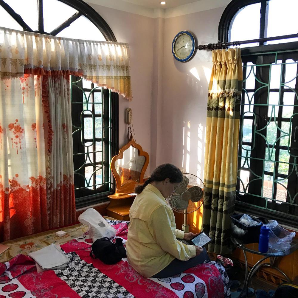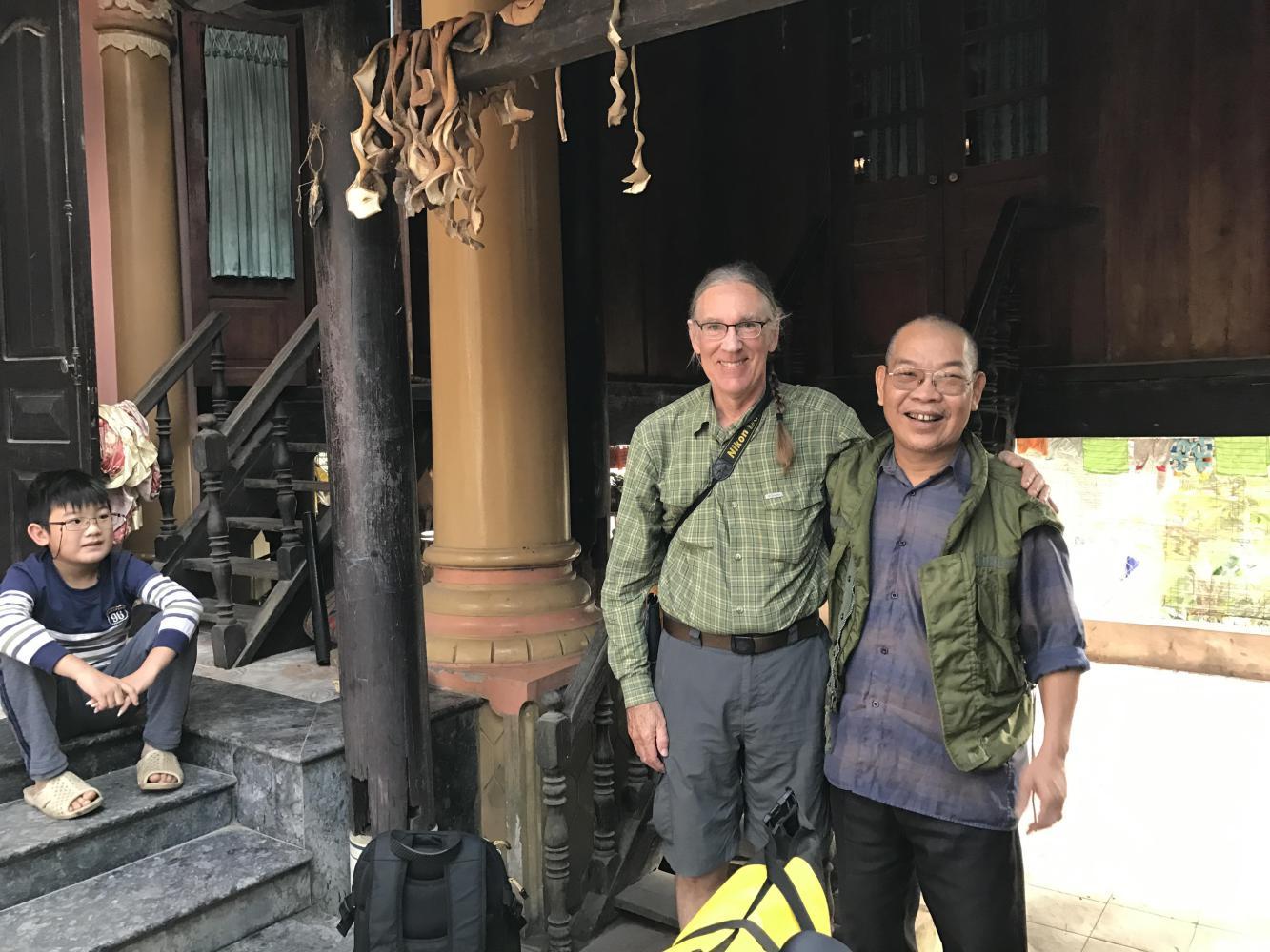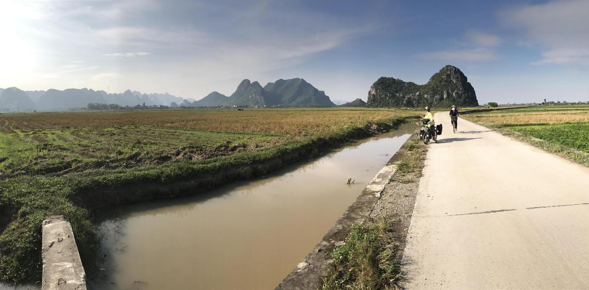 Then the road ran along some water past lots of duck farms. When we noticed an adorable Nha Nghi we decided we had better stay there. It was newish but seemed oldish with lots of wood. The owner was excited we were there and immediately heated water for tea. I mean, I guess you don’t just unpack the bikes and carry stuff up to the room. You first sit and have tea even if you can’t converse. The man seemed like a super nice person and so very excited to have us as his guests. He was vibrating with excitement in his oversized rock-hard wood chair.