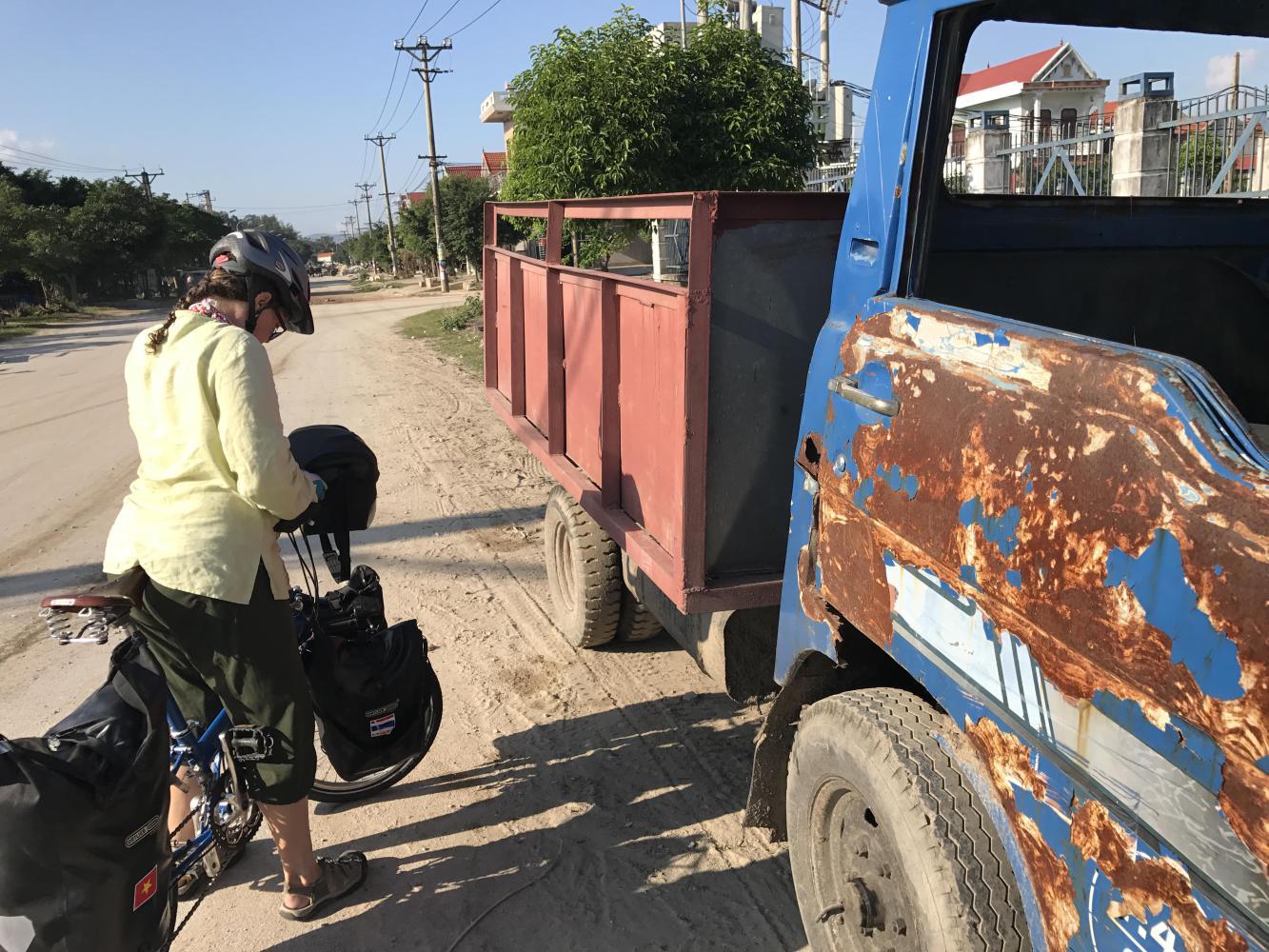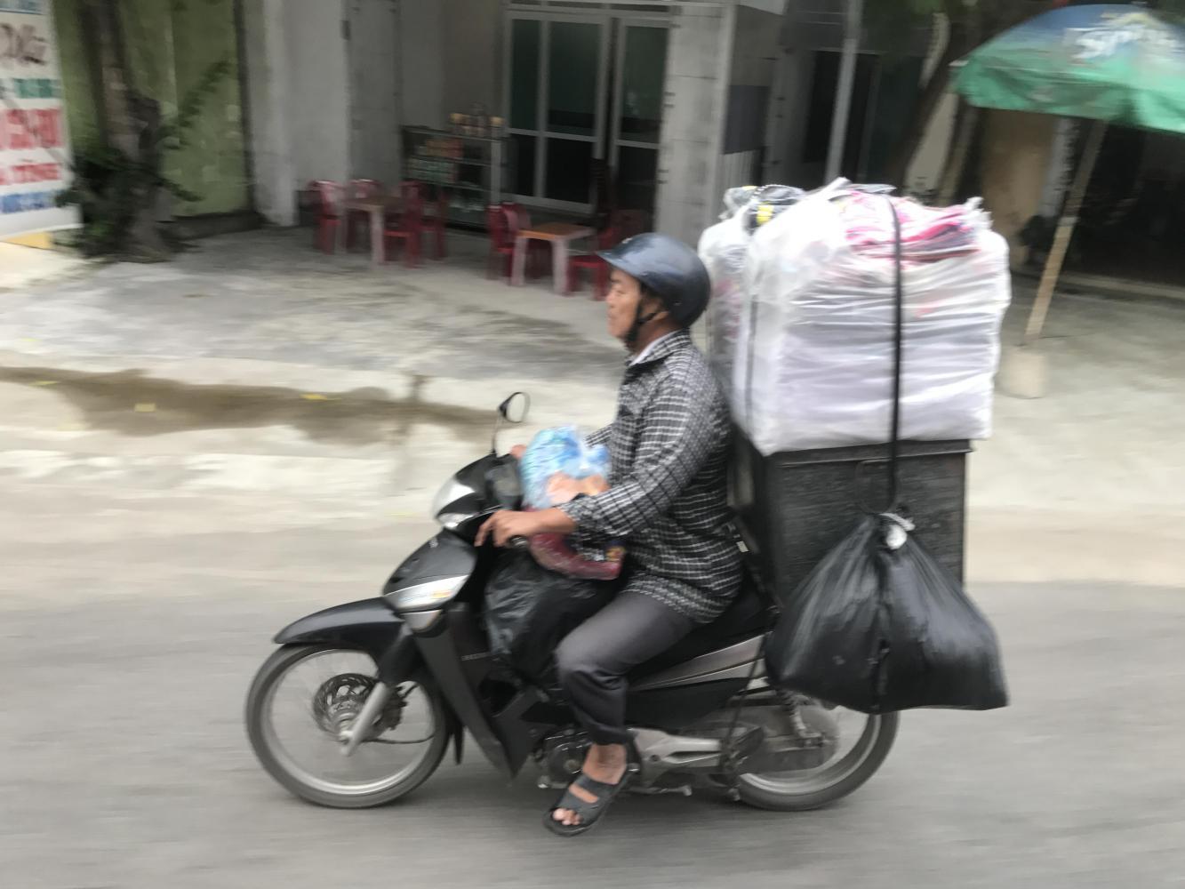 We crossed it and stood on a corner on the southbound side. We had seen a young guy flag a bus for some people, maybe he would for us too. And sure enough, true to Vietnamese kindness, he did, after ascertaining that we had two small bikes and eight bags and that we wanted a large bus with a cargo hold. Unfortunately those are also often “sleeper” buses with permanently reclining seats bunk bed-style, so after he flagged one of those down and the bikes got tossed in as they do, with the motorcycle tires and styrofoam coolers of seafood, we came aboard, took off our sandals as required and stowed them in plastic bags, and crawled into the seats furthest in the back.