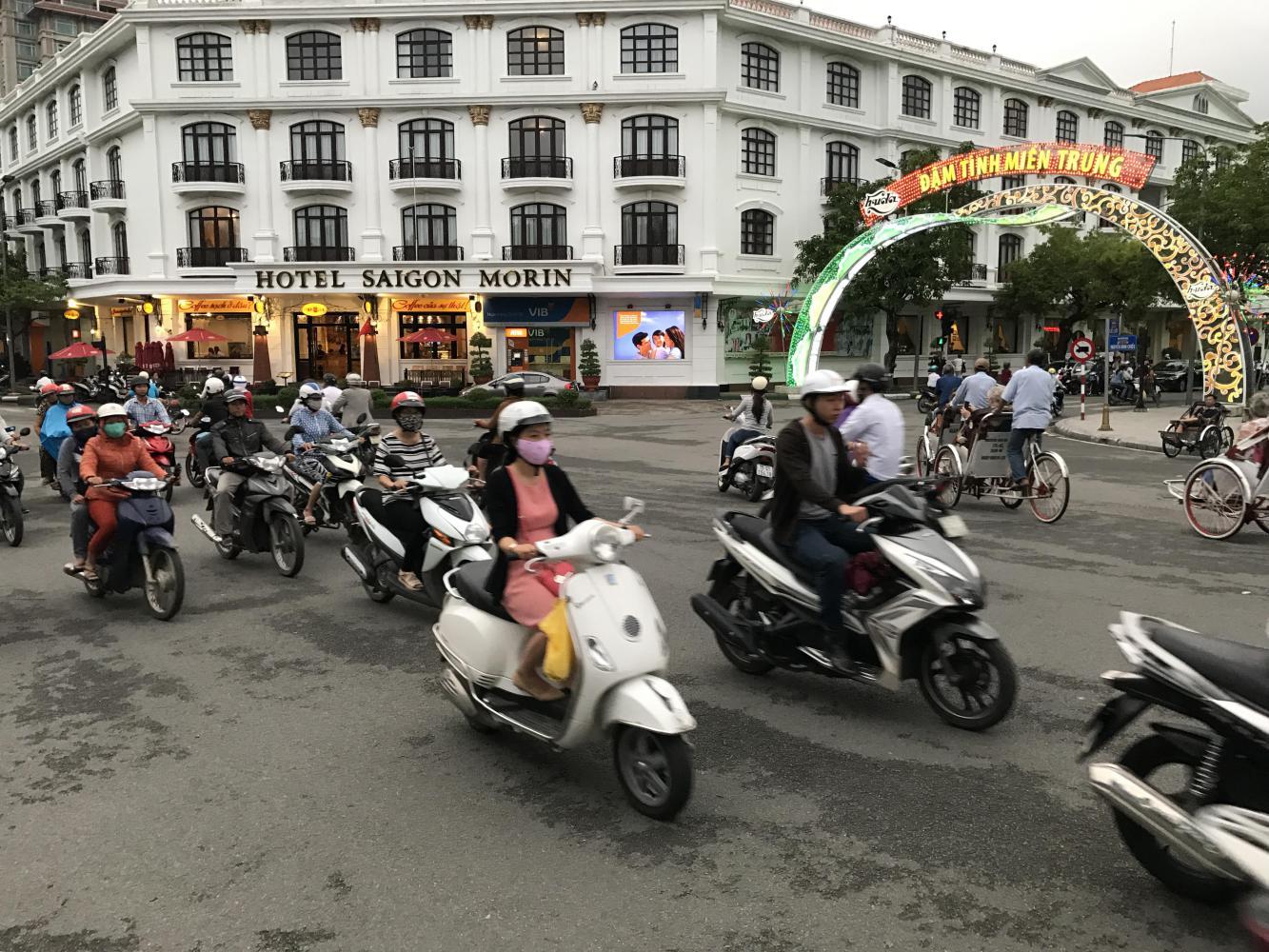 The weather was gray and humid. I was having a hard time with the humidity but we strolled out and took a gander at the riverfront and watched shoals of motorbikes cross a beautiful bridge and perform their traffic ballet at the intersection. Hue seemed like it would be an interesting place. My hand was still itching.
