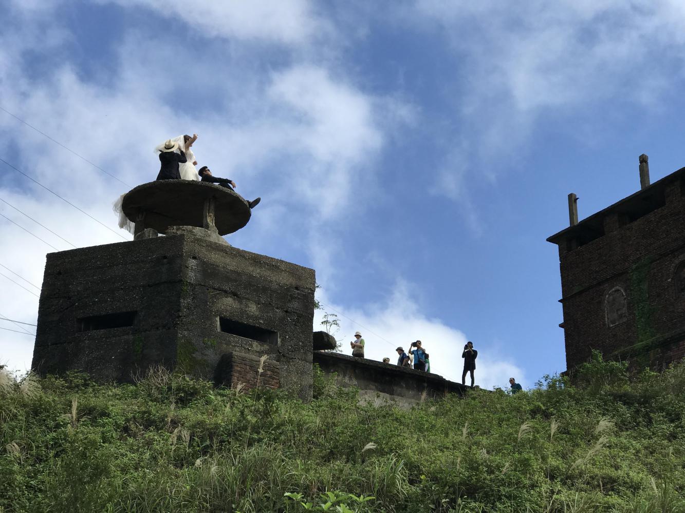When we got to the top, sure enough, there were some old bunkers and possibly an anti-aircraft platform where a bride and groom were posing for photos. It was a big wedding photography production including a step ladder for the bride to carefully get onto and off the cement platform.