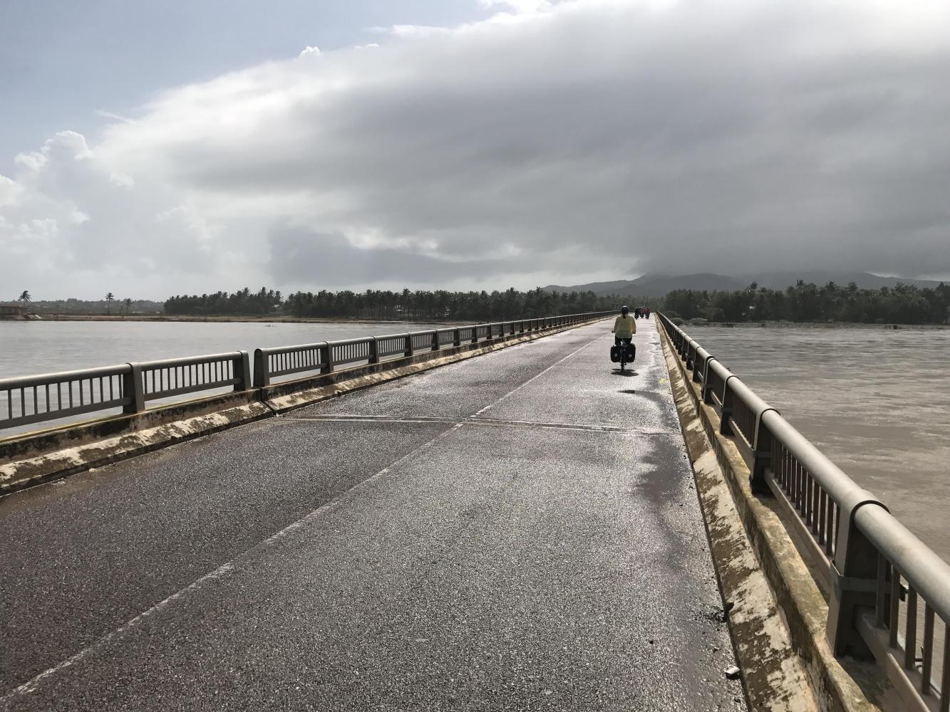 Within a couple of blocks from the hotel after we left we bought a couple of banh mi sandwiches for later. Two more blocks and we had to take cover and get all of our rain gear out. It didn’t last long and soon we were roasting and had to stop to take it all off. The road was in poor condition at first but we loved how quiet it was and that it was only one lane. Again, everyone was astonished, in a very happy way, to see us.