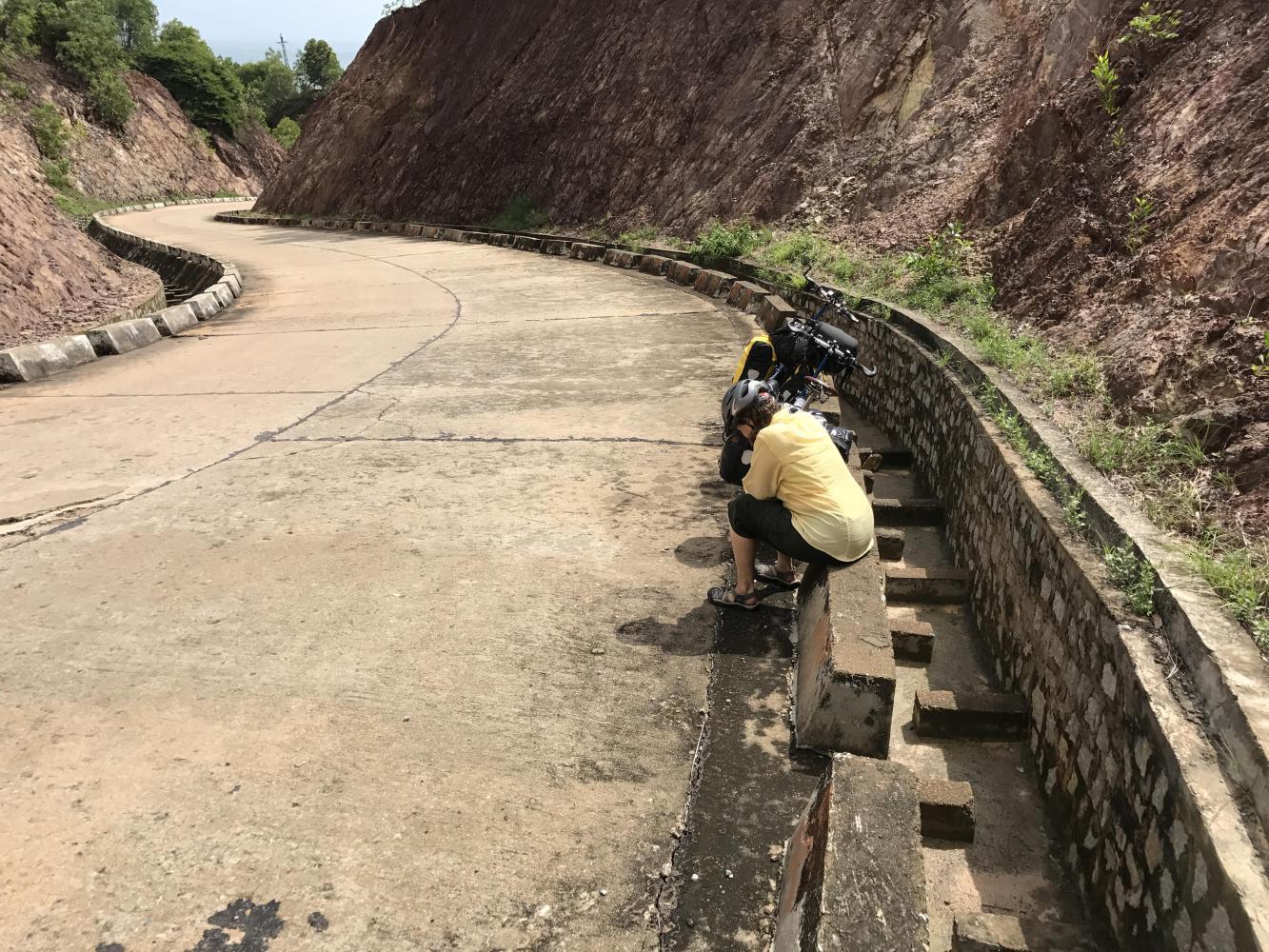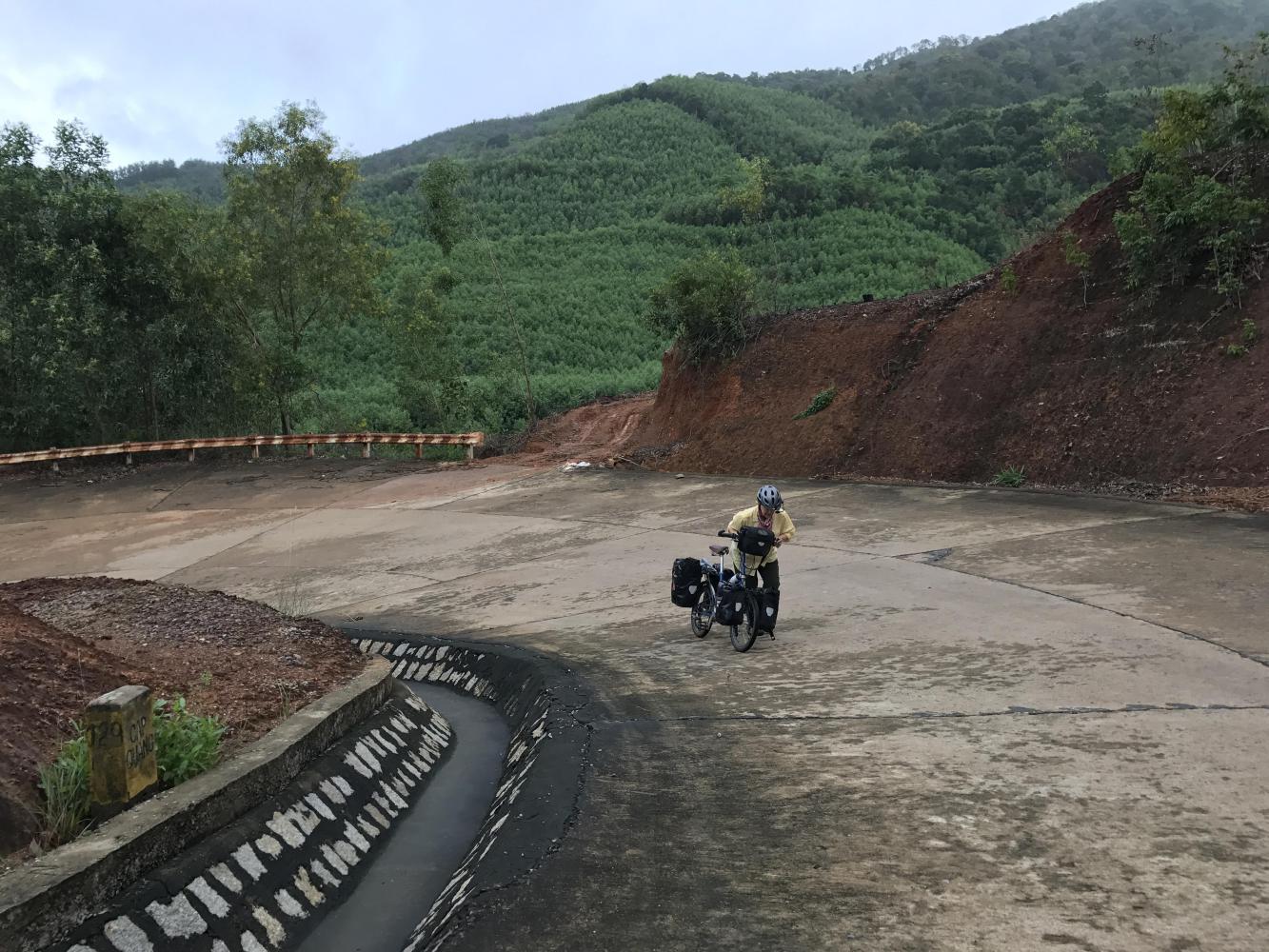 Then the road went straight up for about 500 feet. It was so steep it was hard to even push our bikes. The road engineers had made some attempt to minimize the grade by blasting out a lot of rock (A LOT of ROCK) but the road was still straight up. At least it had stopped raining.