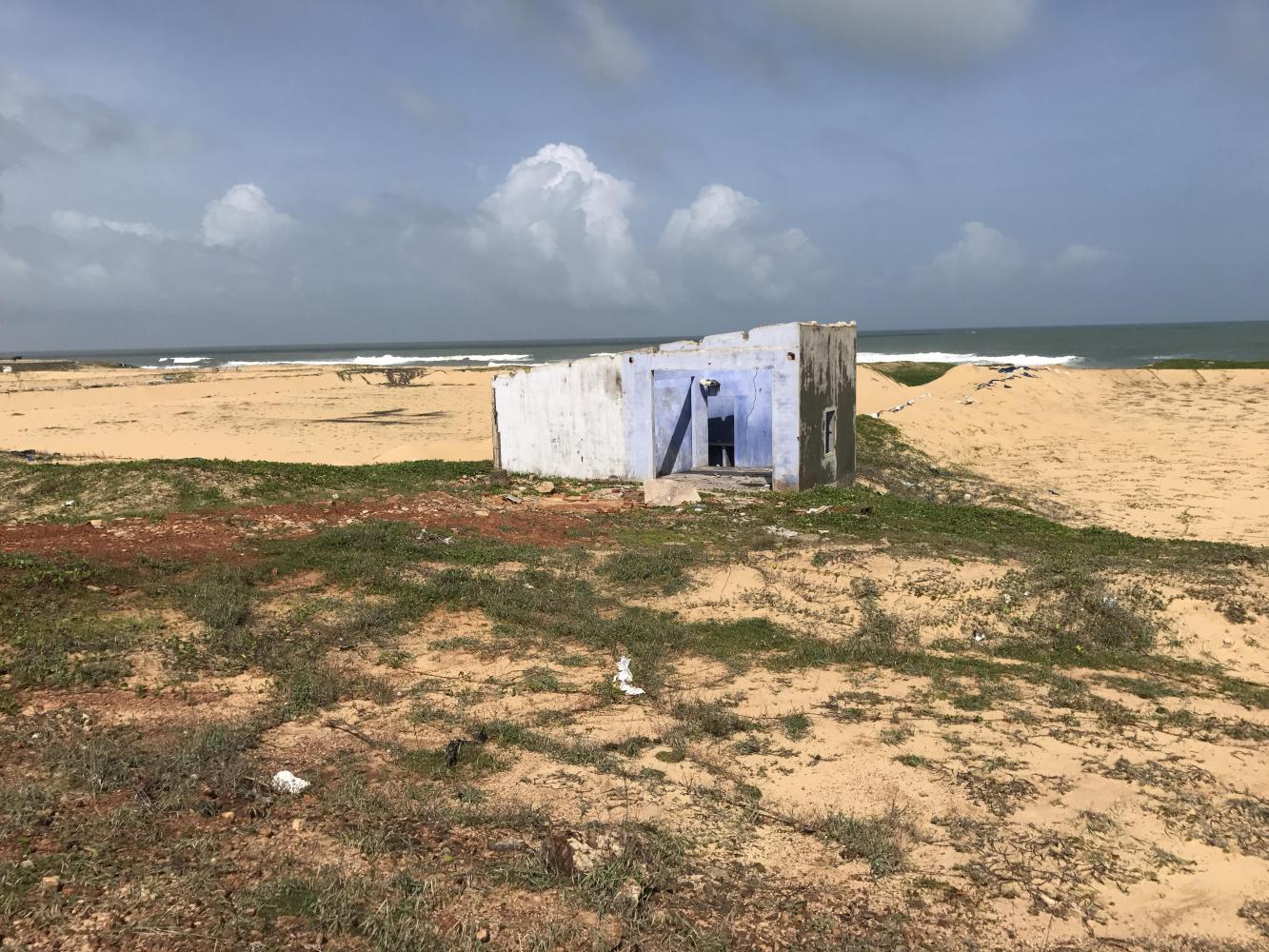 Then the road paralleled the beach about five hundred feet away. Between the road and the beach were fish farms, one after another. I don’t know what they grow in the big man-made ponds, possibly tiny shrimp or tiny fish. Aeration devices spun on top of the water. The land was all sand and extremely dry. The area was kind of depressing it was so poor. Trash was strewn everywhere and more fish operations had gone bust than were operating. Skeletons of buildings were everywhere, deserted shacks, large pond holes dug but never lined with black plastic, walls crumbling, bricks strewn, and a fishy stench blew across the road along with little pieces of styrofoam; two things I didn’t want to smell or see.
