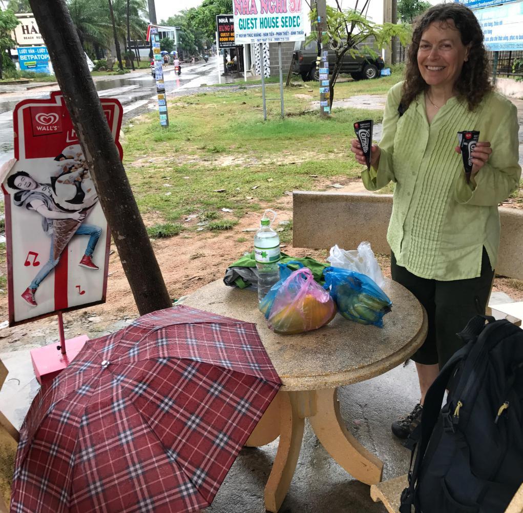 One thing I had spied in Mui Ne were Walls ice cream freezers in nearly every bodega. We had only seen some strange off-brand ice cream all over the country so this was a blast from the past. Those who followed our last trip journal may recall our habit of eating Black and White Cornettos after a day of riding, so of course we had to investigate the freezers. We stopped and had a Cornetto apiece and enjoyed them very much and thought anticipatory thoughts of Thailand.
