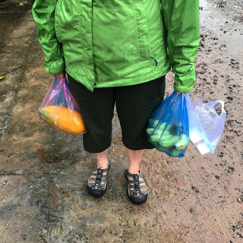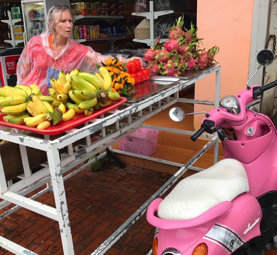 There was no peace for the wicked however, and soon Bruce was ready to go to the market and buy fruit. This is the holy mission wherever we stop, to buy papayas and bananas and mangoes and oranges. To buy little boxes of milk to pour over said fruit and a small amount of our rapidly depleting store of muesli. We have been carrying this muesli since Hanoi. Truth.