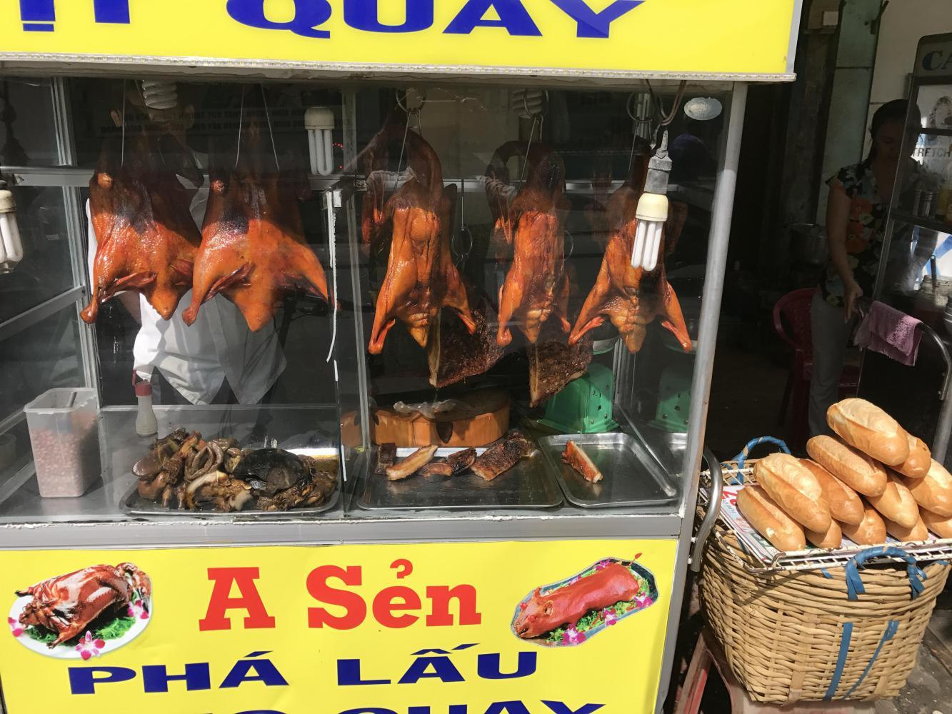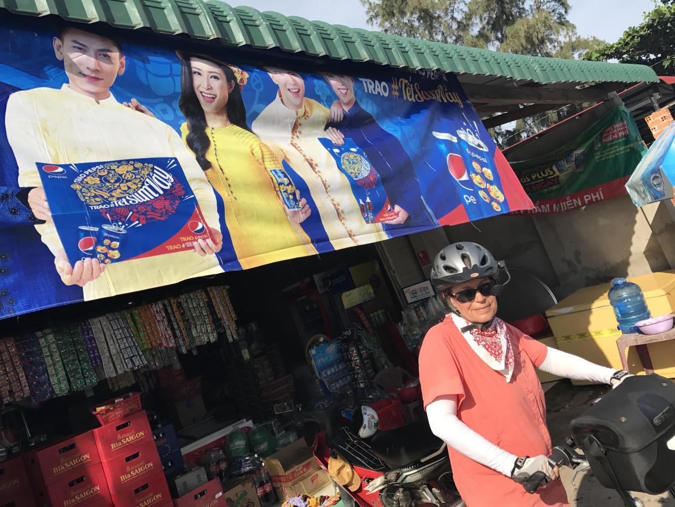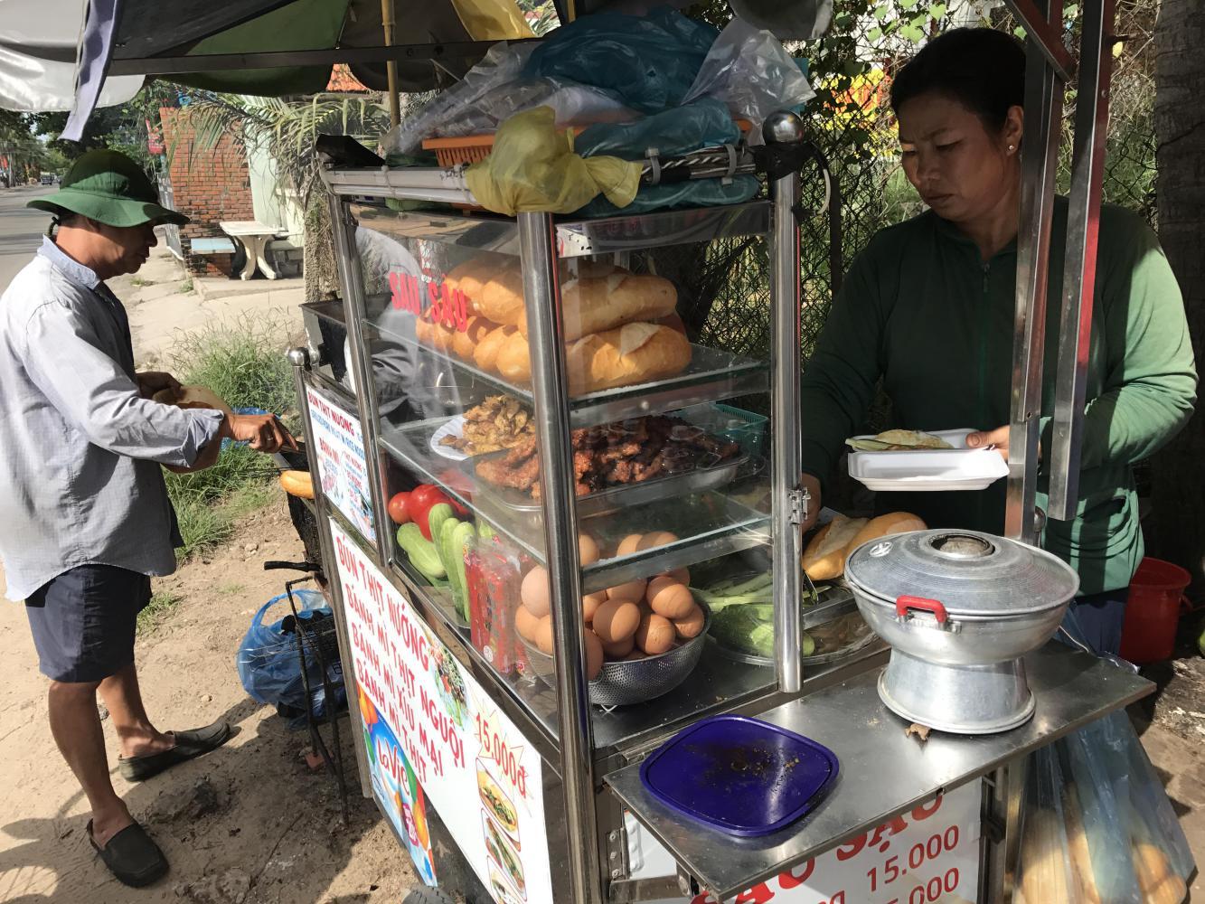 Somewhere along that strip we stopped for our daily banh mi. It looked like an especially good one too. It was a husband - wife team. The husband was grilling pork and chicken which both looked good so we ordered one of each. The man seemed intrigued by us on our funny looking bikes. I told him we had ridden from Hanoi and he was so impressed that he started bowing to me as if to say he wasn’t worthy. A very nice couple.
