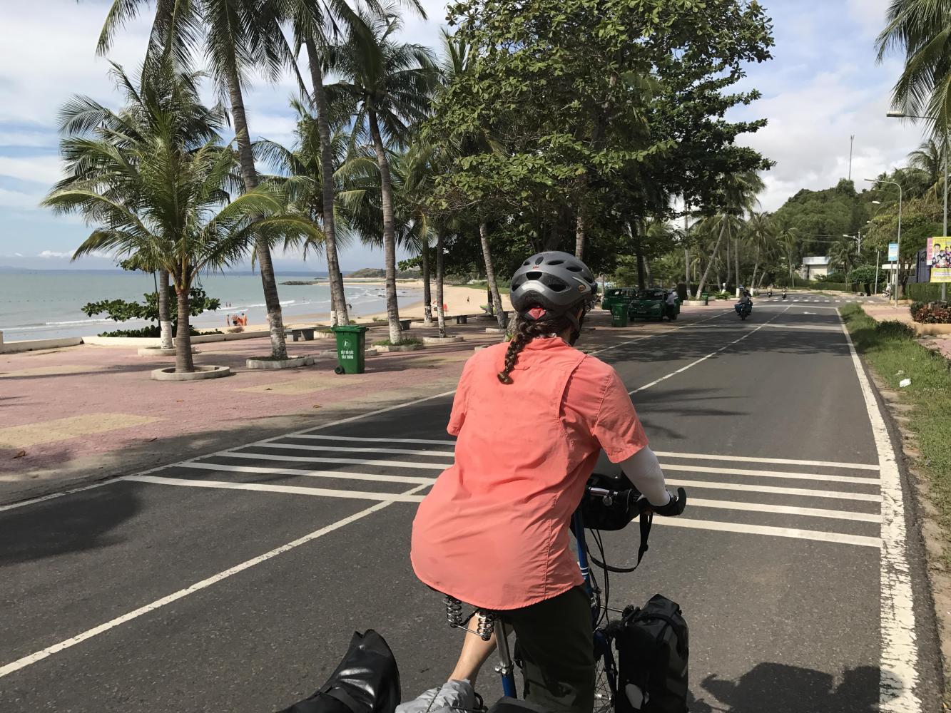 When we finally cleared from all the hotels we could see that the beach was gorgeous but at that point the road cut inland a little in order to go through the large bustling town of Phan Thiet. On the outskirts of town we both simultaneously saw a bike repair shop on a corner. We wheeled into that shop like it was nobody’s business because Andrea’s front brake was screwed up so badly that it didn’t work. Neither of us could fix it. (Next time we bring along a pliers.)