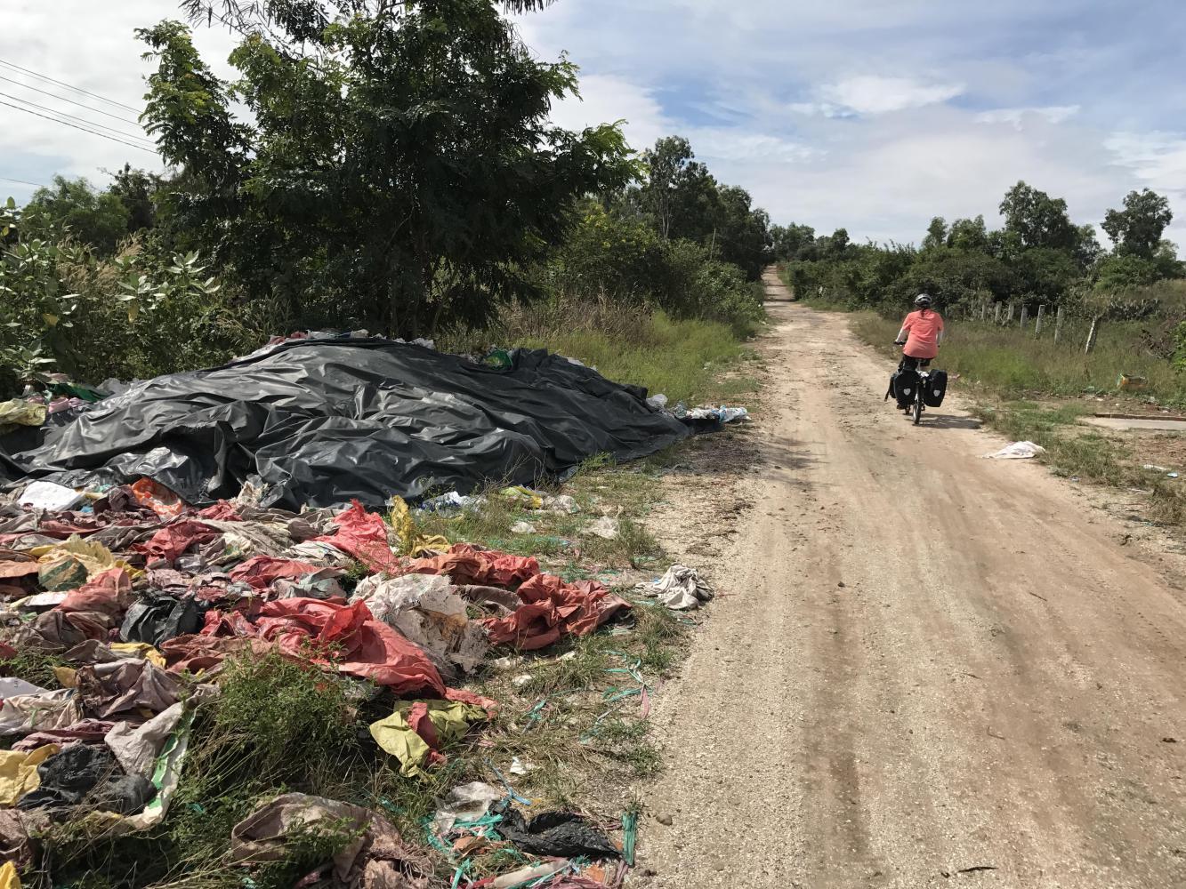 The beach road south of Phan Thiet does not directly connect with the city for some reason and we had to do a squiggle around something or other in order to get on it. On Google Maps it looks straight forward but in reality that road that looked perfectly nice turned into Hell in a matter of feet. We should have turned around at that moment but we couldn’t believe that the rough quality of the road would continue so we doggedly kept at it. A little further on it turned into Double Hell. You’ve all heard of Double Happiness, well, this was the opposite. This road was harshing my normal calm. I couldn’t believe how bad it got. We were essentially riding on a rutted dirt road where everyone dumped their garbage. There are seemingly no dumps in Vietnam but instead it all gets tossed alongside roads. This one was the worst dump we had seen. And it went on and on. Finally, we had to cross a huge mud puddle and I refused because we had just spent a lot of time cleaning our bikes. I went around through tall weeds but it turned out to be an area where kids came to break bottles. I was literally pushing over an area of solid broken glass. Andrea wisely went through the water. It was awful and we were in such a remote and forbidding place that it even started to feel like we might be in danger. In two years there will probably be a big fancy resort there since it encompassed a lot of vacant land. Maybe it was an airport during the war. It had a bad vibe.