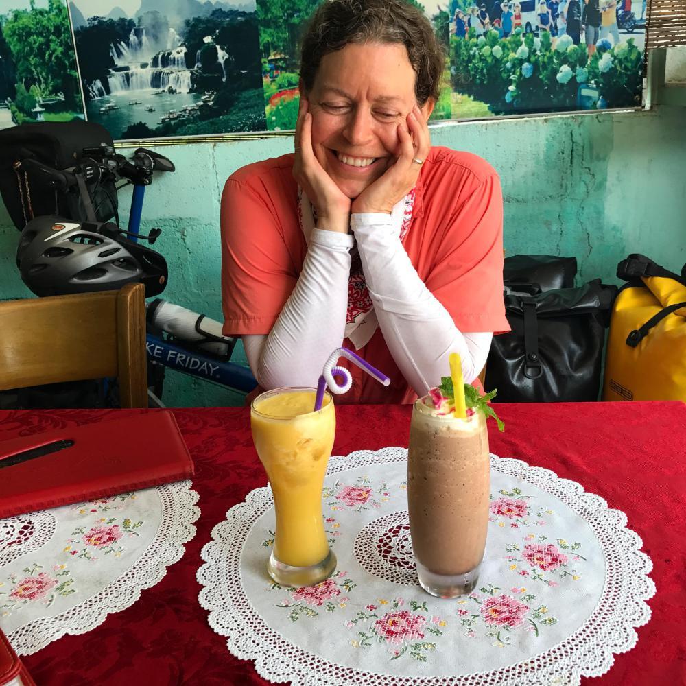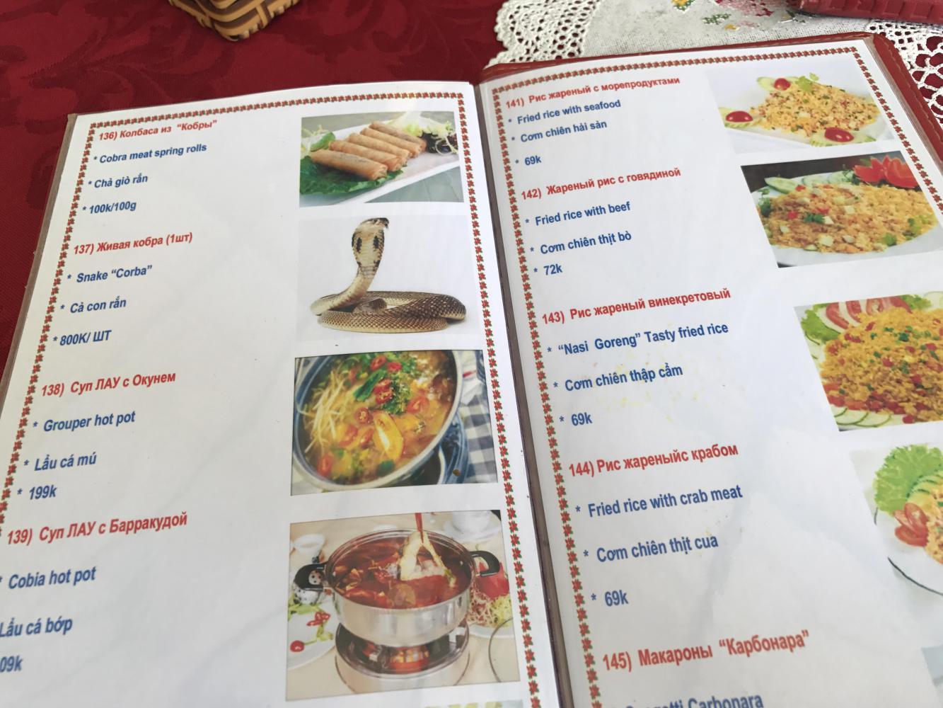 We stopped at a restaurant for a cold drink since it was quite hot and humid. It was a restaurant that had hundreds of items on the menu including a coffee ice cream shake which Andrea wanted. I got a mango shake. I noticed the most expensive thing on the menu was cobra for $40. We only wanted drinks because we were rather bravely planning to eat our banh mi there. Kind of poor taste to eat someone else’s food at a restaurant but it didn’t really matter. I sensed the owner had no respect for Americans at all. He was one of these rare Vietnamese who apparently loves Russians. He spoke fluent Russian too. There were a few Russians in the restaurant (two of them happily eating beet borscht!!). (We have not seen one beet in Vietnam so that was a mystery.) The whole experience being there and sort of shunned was a new one for us but we were happy with our shakes and we ate two of the best banh mi ever.