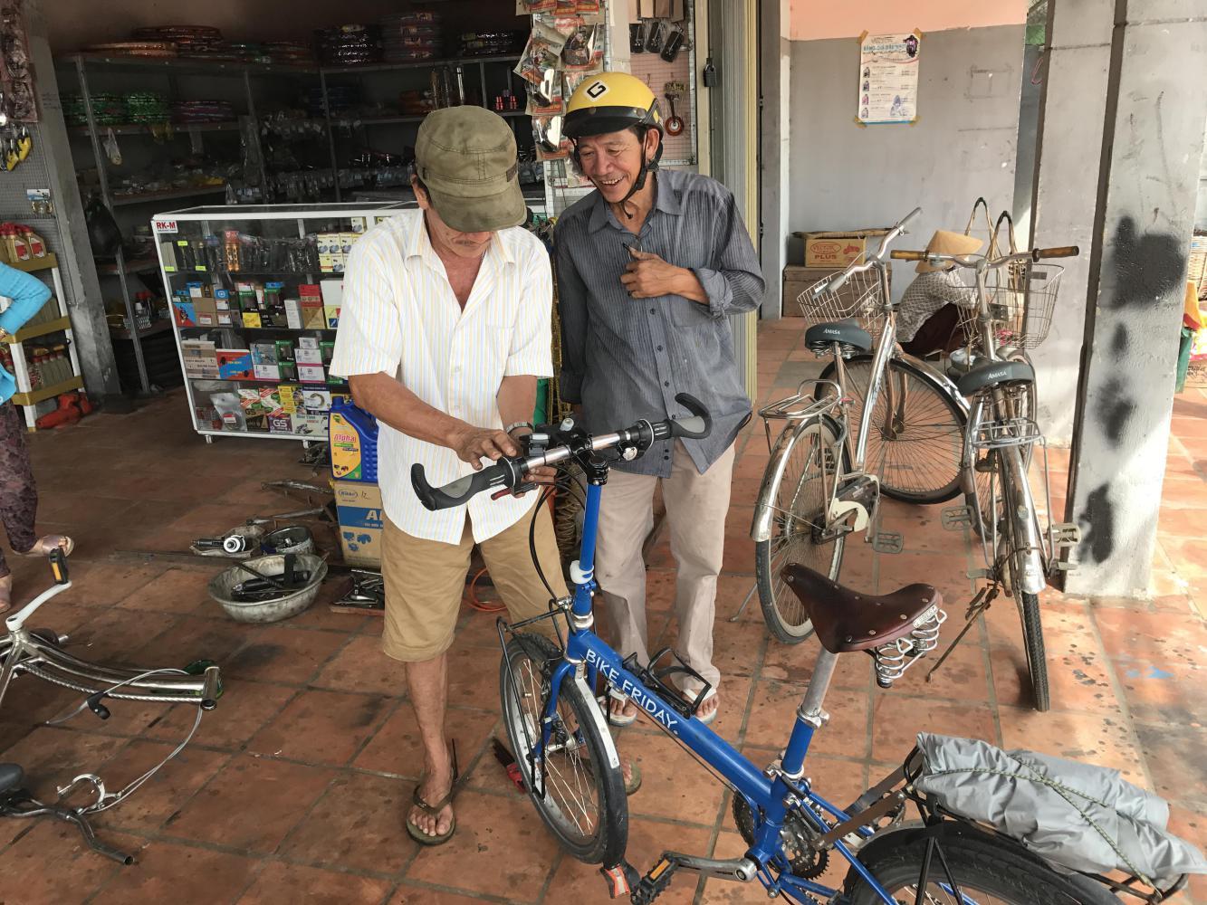 We made it simple. No words needed. We showed him the problem and as I took a couple of quick photos of him and his friend behind urging him on, he had the brake working perfectly. I didn’t even get to see what he actually did! He sheepishly asked for the equivalent of 90 cents for his work. As we left I could see that he was more confident and I’ll bet he won’t get as panicked if other foreigners need work done. He was a good mechanic, no words needed.