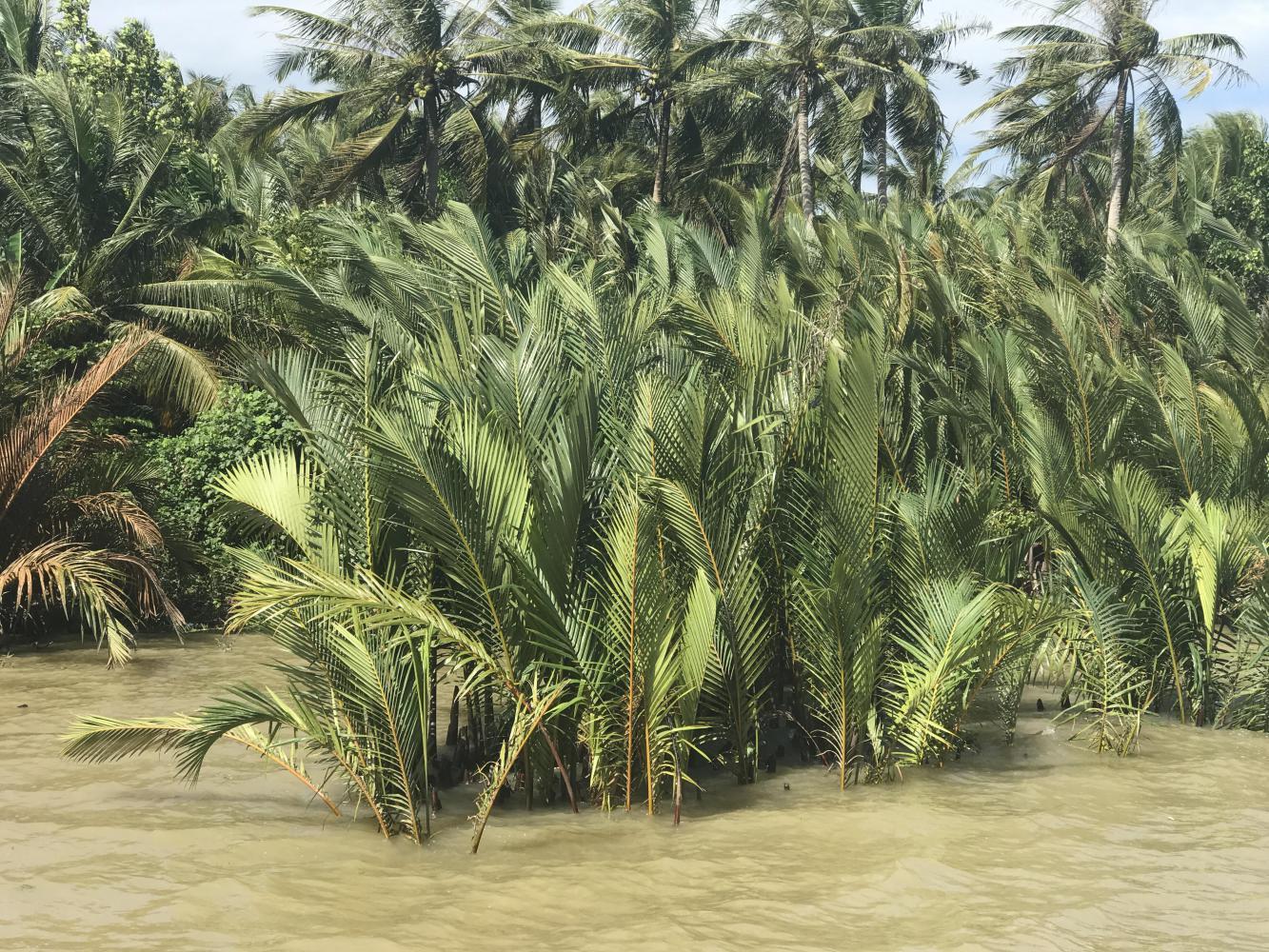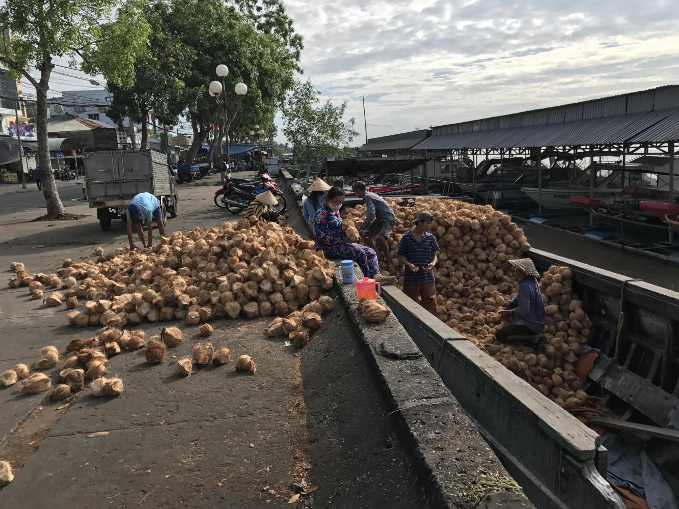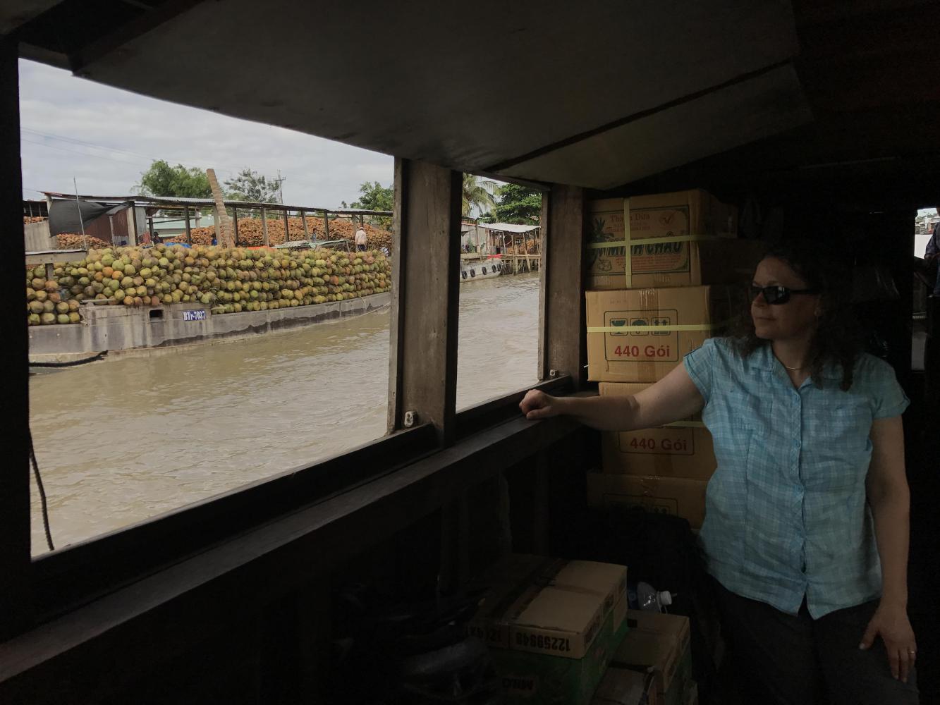 We saw coconut processing plants with enormous piles of coconuts outside them. The only way of loading and unloading a boat full of coconuts was by hand. A person down in the boat would throw two at a time to someone on shore. We saw this over and over and I kept thinking, ‘conveyor belt?’ After watching them for quite some time I realized they were also sorting the coconuts as they unloaded. So laborious. I mean, these boats had thousands of coconuts and all were picked up and thrown by hand and then someone else picked them up to throw into trucks. Coconuts seemed to be the main crop on The Delta. I had no idea so many coconut palms grew on The Delta.