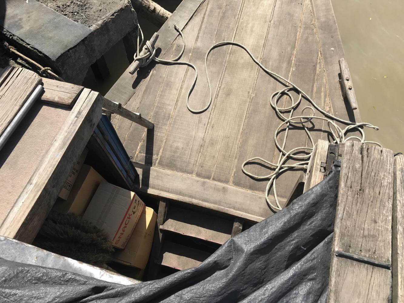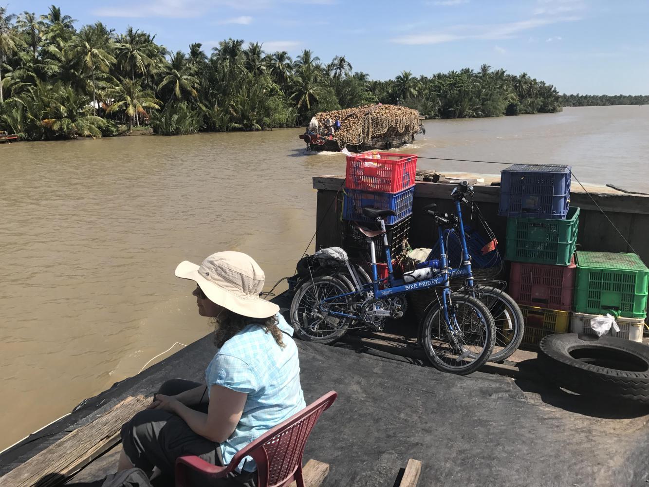 The boat was easy to spot because two other foreigners were already sitting on top. The men filling the boat with cargo were very nice and packed our stuff on board. The bikes went on top and the panniers down below with lots of cardboard boxes. Before getting on we looked around and immediately found a banh mi stand. With two banh mi for lunch we were set. We had water but after looking around the boat a bit we saw no toilet. The captain and his helper did not speak English so we didn’t know if we would be stopping or what. I was scared to drink any water and Andrea was scared if I didn’t due to my history of overheating. And it looked like it would be a scorcher on top. The rain now seemed long gone, finally.