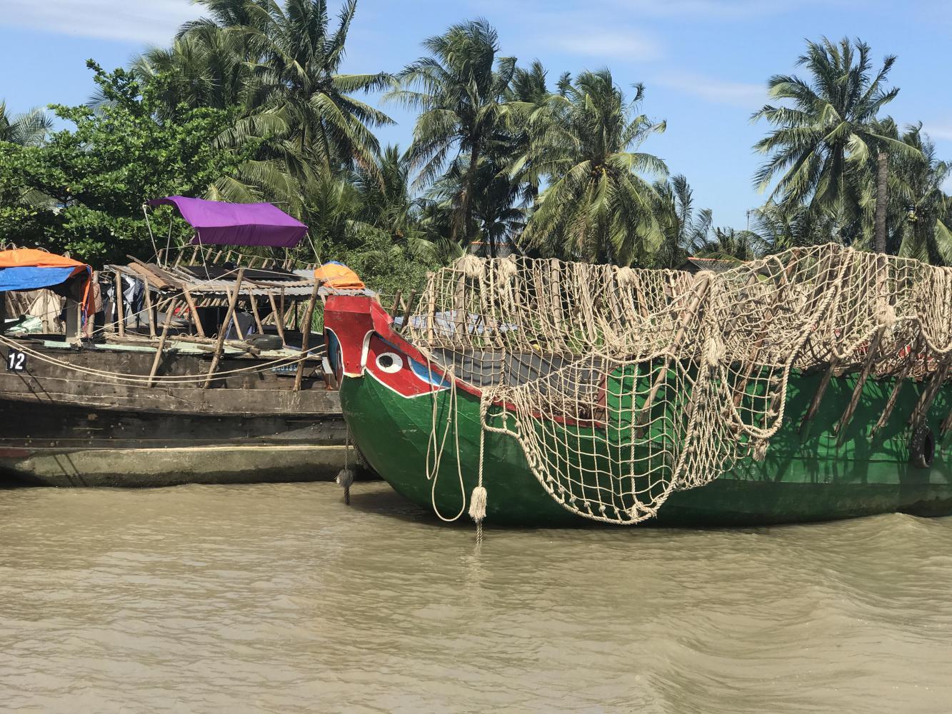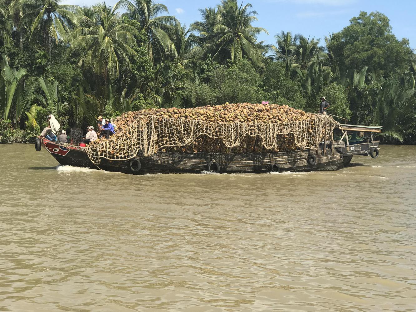 As our trip progressed there were more and more boats loaded with coconuts. Some had the husks only and some the center nut part. More and more and more coconuts everywhere! It got to the point where just about all we saw was coconut boats. Some had netting on all sides to enable more coconuts to be loaded onto the boats. These boats looked like pirate ships. Coconut pirates! However the crew waved and smiled - hardly pirate behavior.