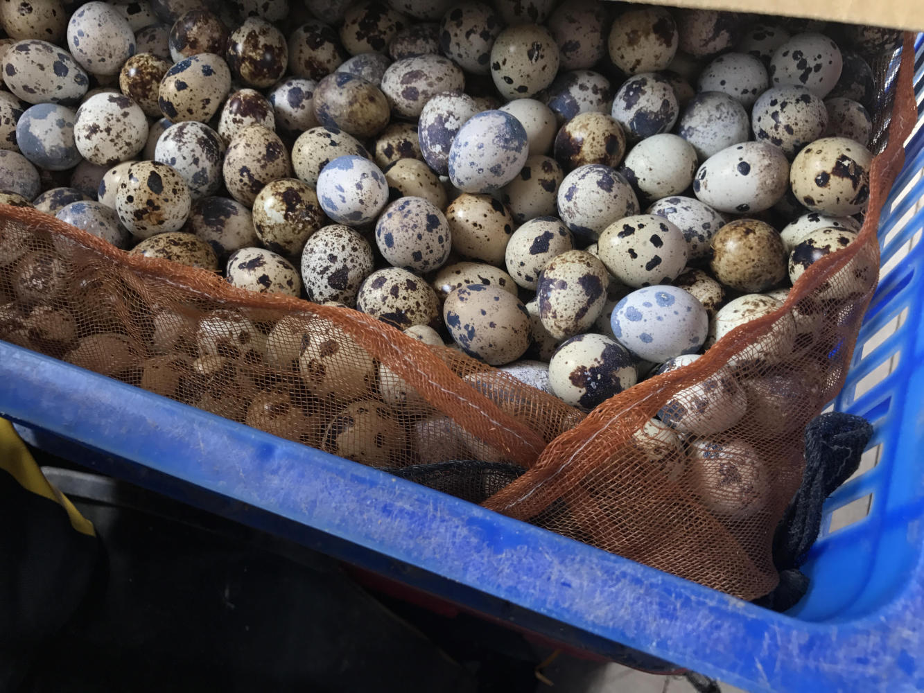 After we boarded after the second stop the captain decided we probably would like to be down below for the rest of the trip and brought our plastic chairs down. That wasn’t necessarily what i desired but it did probably give me a few more years free of skin cancer. There was more room down below since all the bags of sugar had been distributed. At one point the captain told us to not sit on certain cardboard boxes and as soon as we got off them I heard little cheeping sounds. Chicks? No idea what was in those boxes but possibly something alive. The quail eggs were safely visible so we didn’t sit on them.