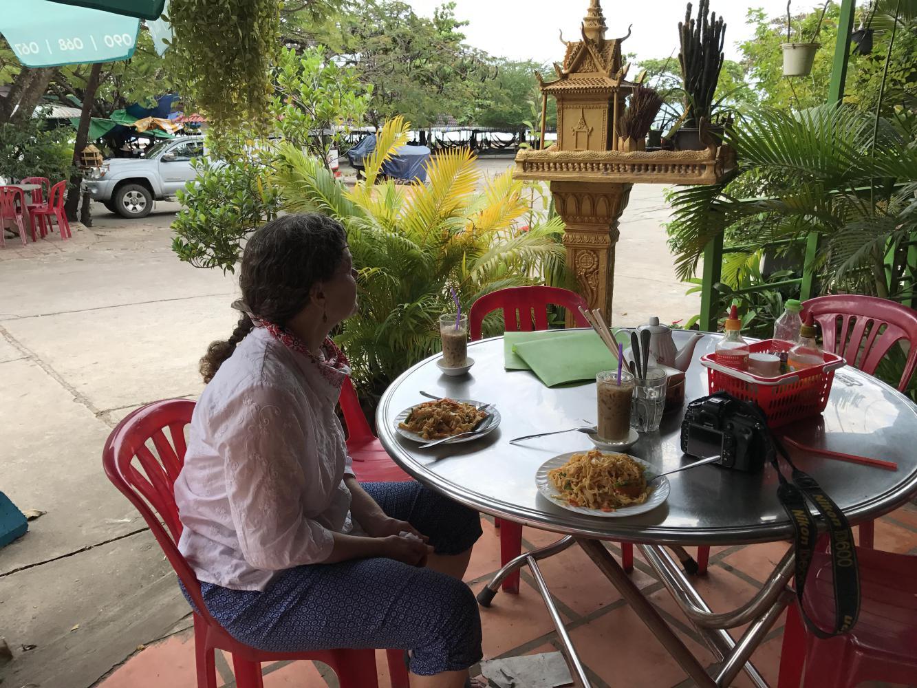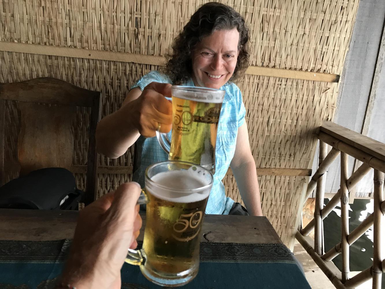 After our excursion into the countryside we coasted down the hill to the same bar overhanging the bay and ordered the same happy hour beers. Then, we went next door to Kimly’s Seafood Restaurant as we had the night before and I even got the same dish. Maybe Kep had lulled me into a state of contentedness and I figured why mess with perfection? A sparkling mug of draft beer while catching the last rays of sun across the bay and fresh squid (more sustainable than crab which is being decimated in Kep) at Kimly’s were both perfect to repeat. It’s nice to not go and go and go on our bikes from one town to another all the time. But to have the bikes to explore places more fully is what this biking thing is all about for us. Being in spread-out Kep bikes are wonderful things to have.