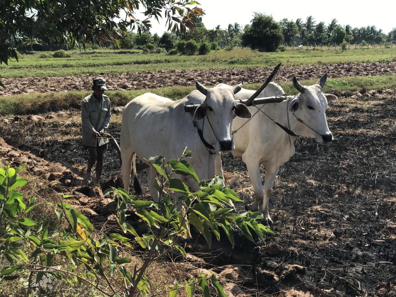 To get to Sothy’s we rode back a few miles the way we had entered Kep the day before and then found a short cut over to the main road saving us two or three miles. The short cut was a narrow dirt road that angled between farm fields. We watched as a farmer directed a single blade plow, pulled by two cows, to cut into the parched clay. It looked like a tremendous amount of work for little gain - hard clay giving up a few inches of the top. Maybe when the rains come months from now it will be a tiny bit easier to prepare for rice to be planted there.