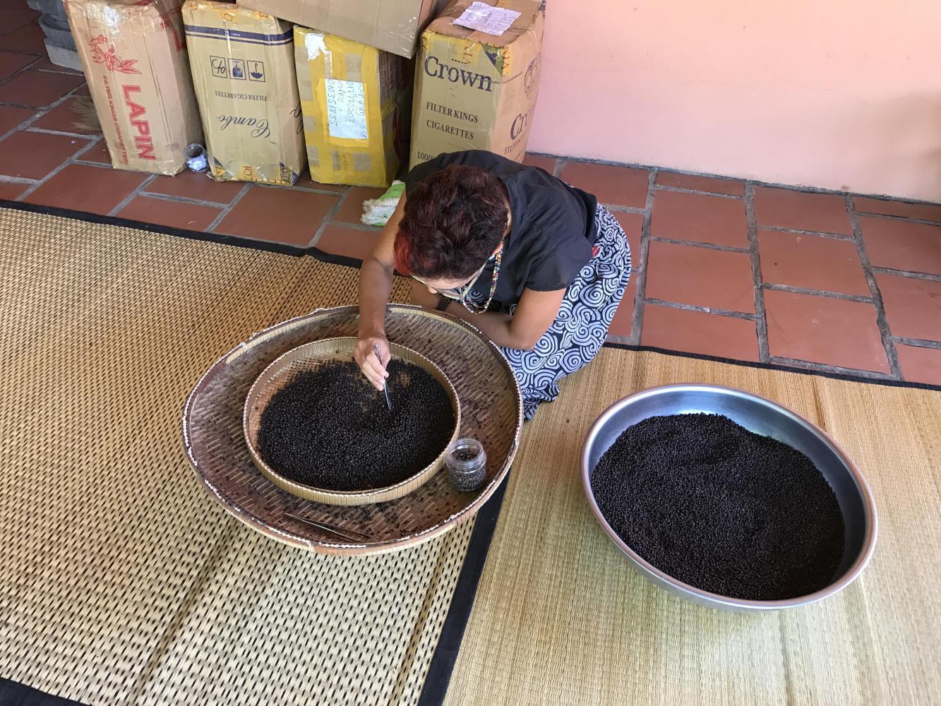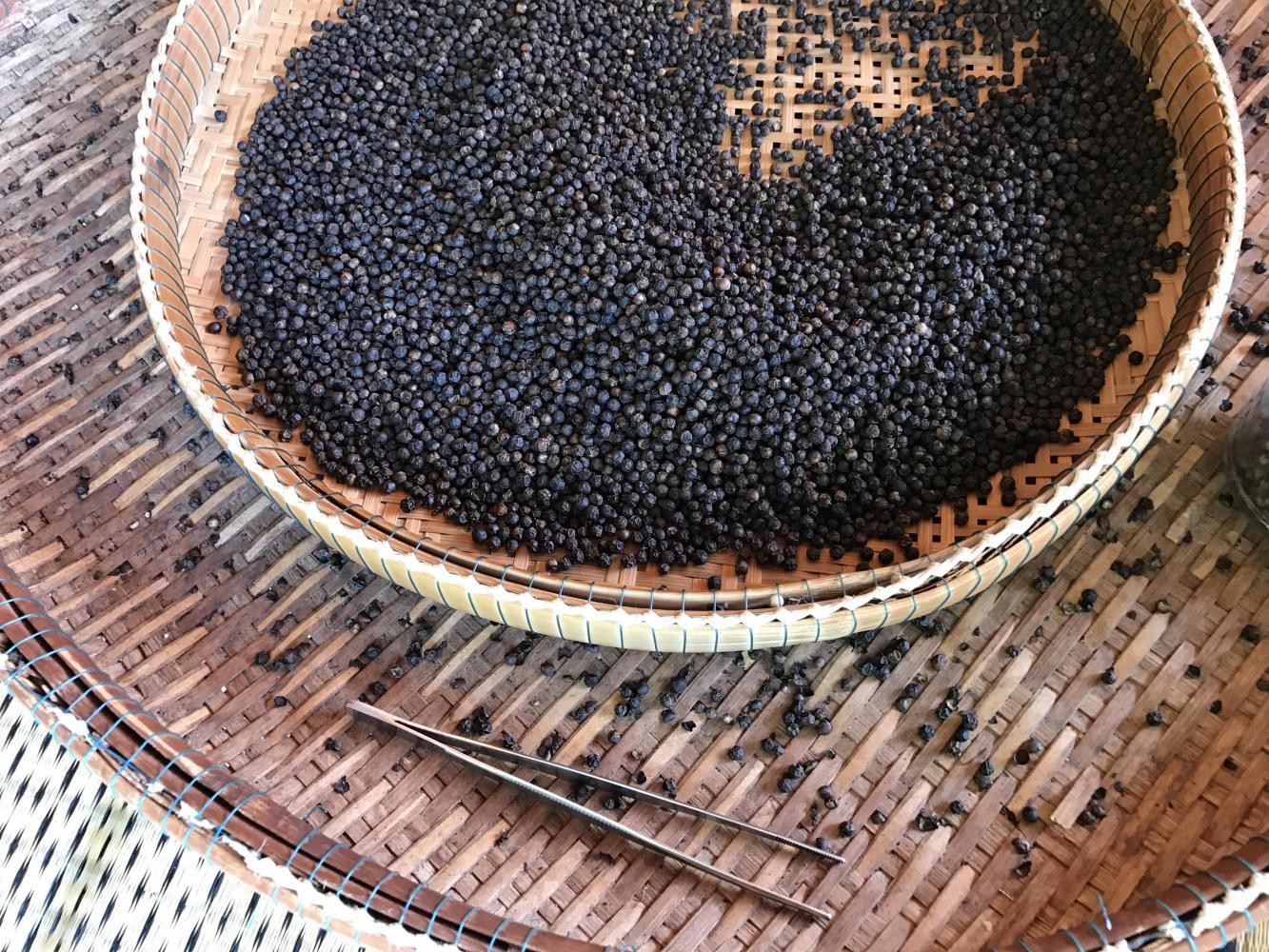 At Sothy’s dining area we learned that black pepper corns - the most common to us - are the ones picked from the vines before they are mature. They turn black when they are air dried. The white pepper corns have the outer casing removed after they have been boiled briefly; a labor intensive rubbing by hand of the pepper corns in bamboo trays. Red pepper corns are the fully ripe ones and taste hotter. I tasted one pepper corn of each and my mouth was fully alive for a half an hour.