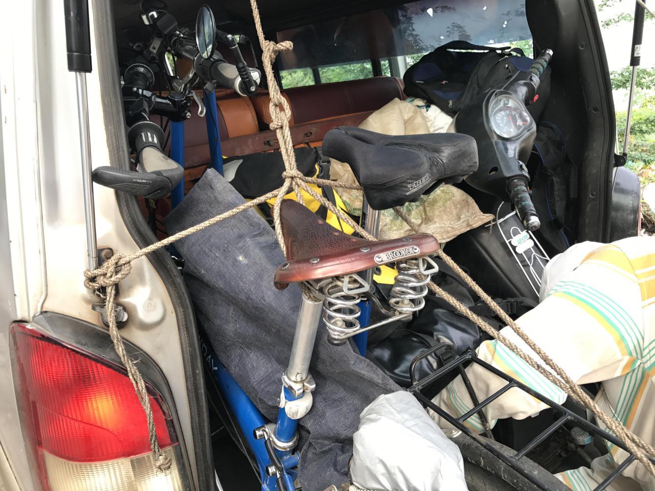 Andrea and I squeezed into the back seat so we could tell the driver to stop when we noticed one of our panniers falling out the back. The driver hadn’t packed them very well in my opinion. But, then, I pride myself as a Super Packer. When you collect as much stuff as I have all my life you learn how to pack things so they take up the least amount of space. But everything was fine and along the way we picked up more riders and their stuff wedged ours in even tighter.