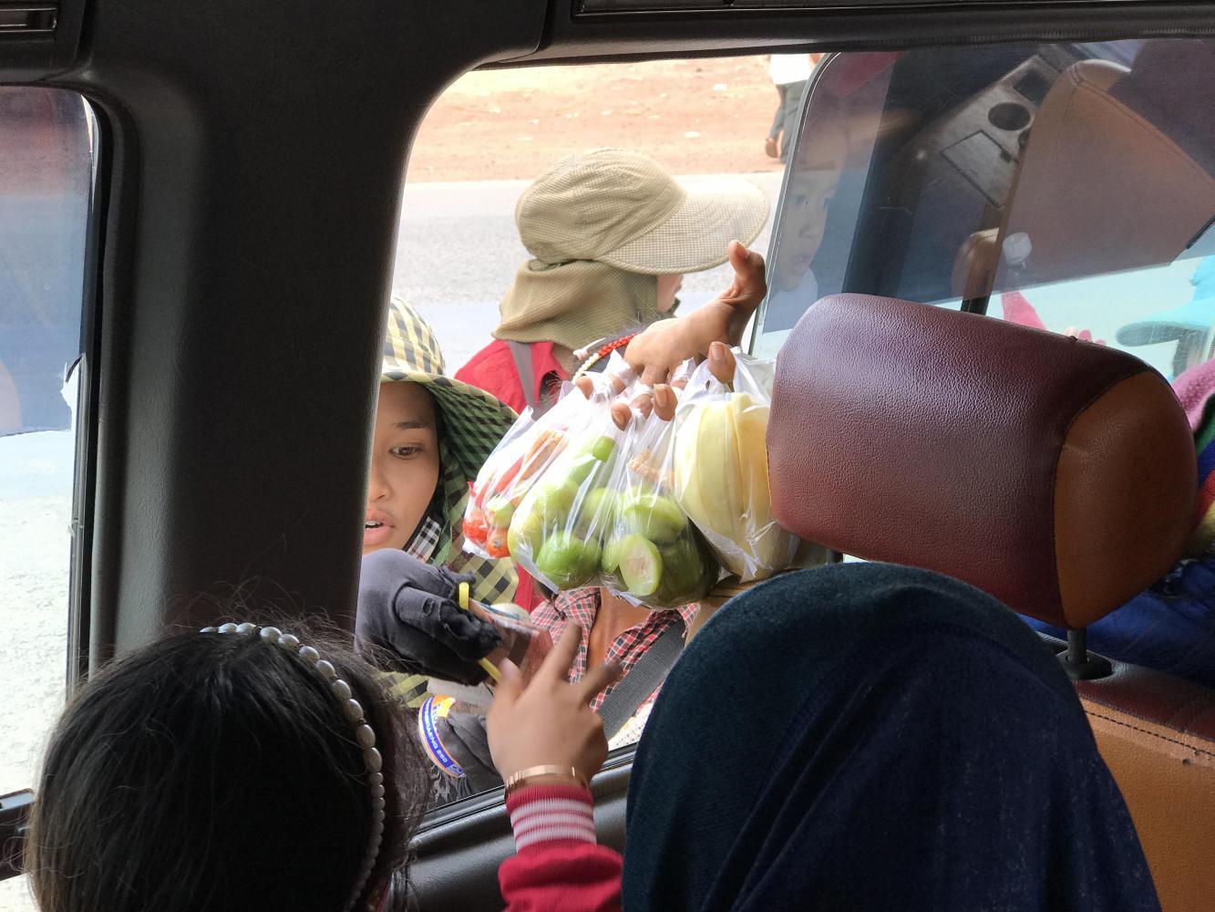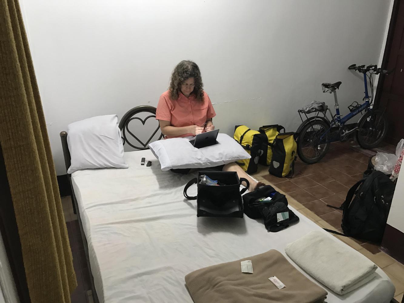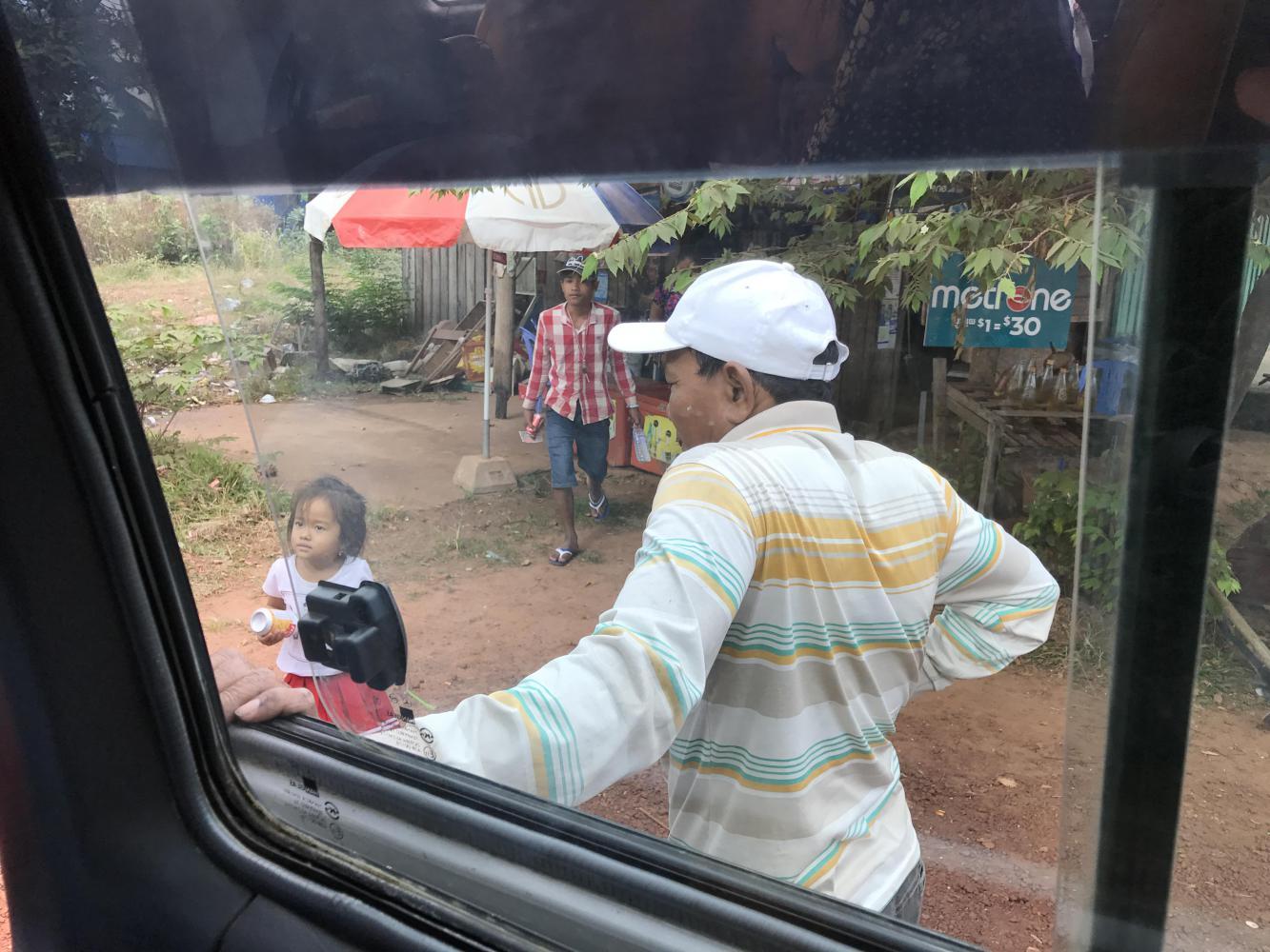 Meanwhile the driver was passing every vehicle on the road and increasing his speed as the trip progressed. We were all rather nervous about that. Seriously, he passed every single vehicle we encountered. He hit bumps that sent us flying about and me looking back to see how our bikes and bags were doing. Andrea and I exchanged glances and silently ran reconsiderations through our minds about riding the 150 mile stretch of Cambodian road on our bikes. But we also thought about a guy like our driver on the road checking his phone every three minutes and we on bikes on the shoulder-less edge. And the hills were a constant up and down reminder of why we had chosen the crazy van ride.