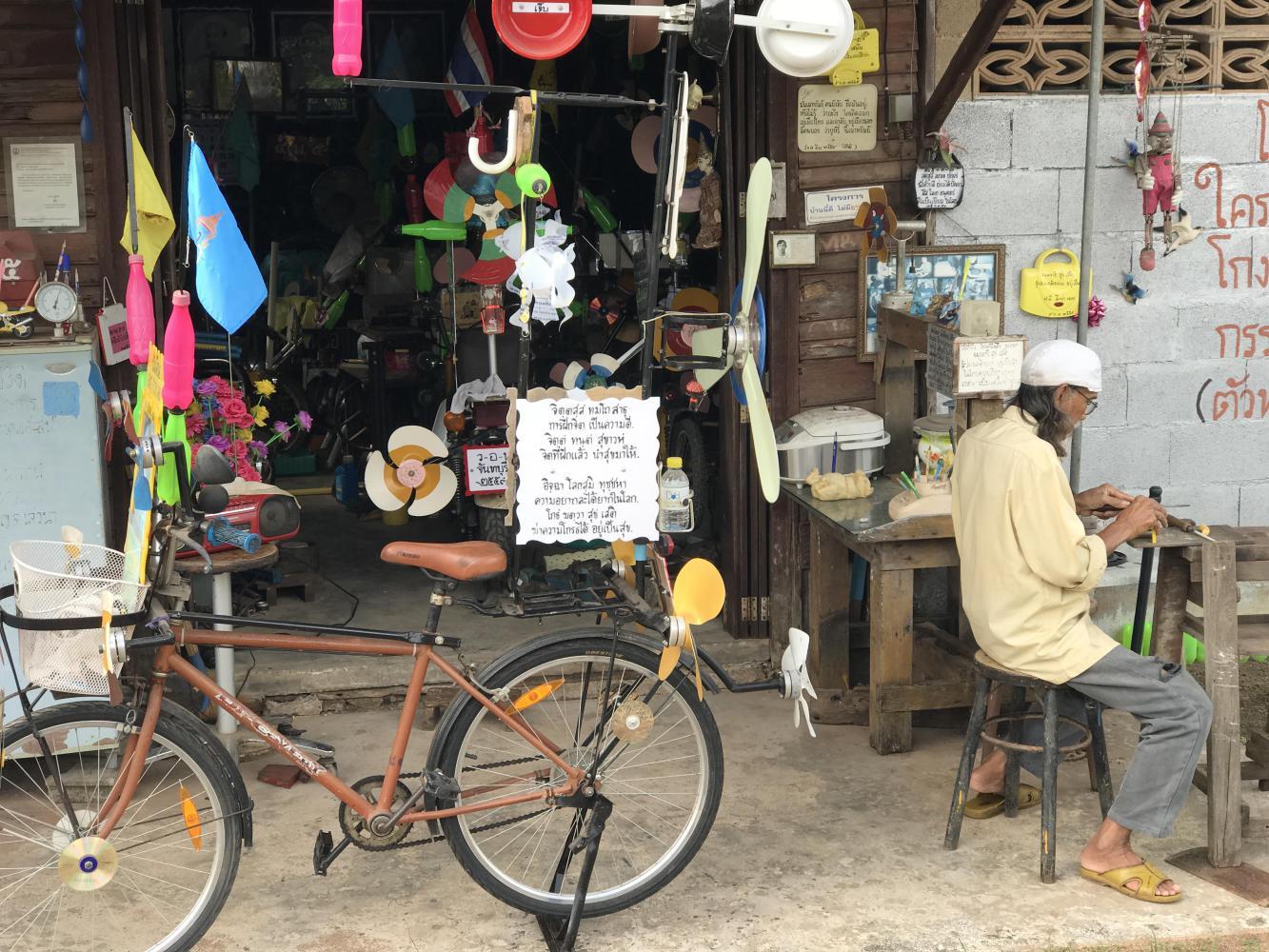 We continued down the road but for only a block or two before several bicycles caught our attention. They were all outfitted with various whimsical wind whirlygigs, propellers, fan blades and other found junk. A man was busy outside his house/workshop making more odd things. We stopped and he greeted us, glad to see we were touring on bicycles. We told him where we had come from but other than that we were frozen by communication shyness on all our parts. He went back to work. We peered into his house for a few more minutes to see all the other odd “inventions”. He was obviously having a lot of fun in his retirement.