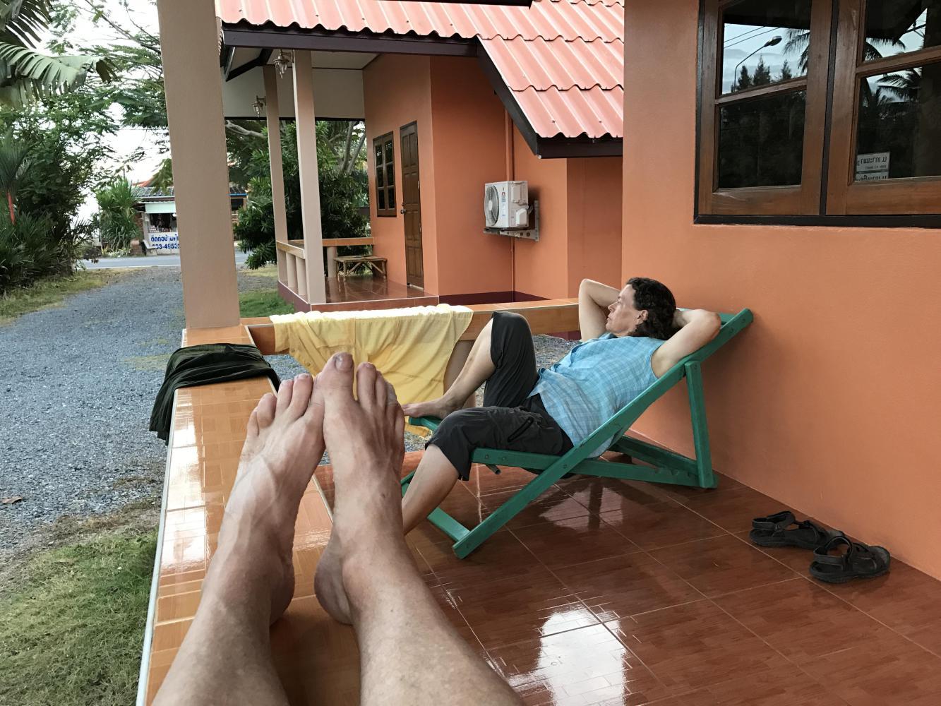 It was a rather easy going day ambling on nice quiet roads hearing beautiful music. The first beach we came upon we decided it was time to stop. We had only ridden 15 miles. The nice bungalow we found had a lot to do with our stopping so soon. We continued to relax on our porch until it was time to go find dinner. We were lucky and found some delicious curries to take away in plastic bags from the central market a short walk from our bungalow. It had been a day of respecting the old but in the end we certainly enjoyed our very modern, new, air conditioned bungalow. This is cycling at its best in Thailand. One could have a day like ours anywhere in Thailand, I’m quite convinced of it.