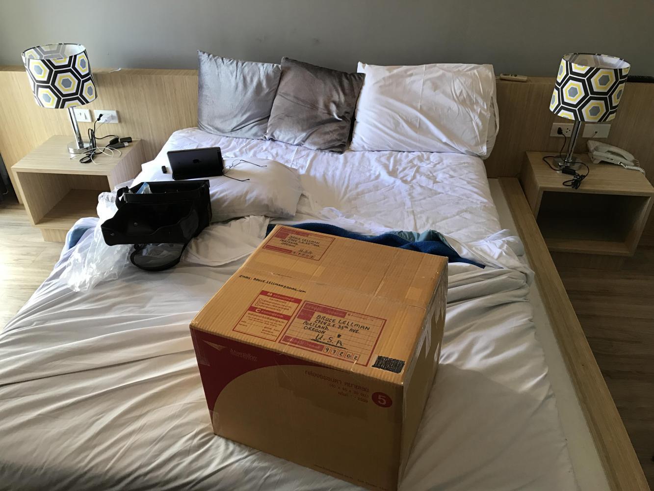 The next day was spent procuring a box, packing it full of stuff, including the tent, mailing it, and exploring a nearby mall/market area and an old temple. We reorganized our suddenly spacious panniers and prepared to leave for Bangkok, which neither one of us was looking forward to at all.