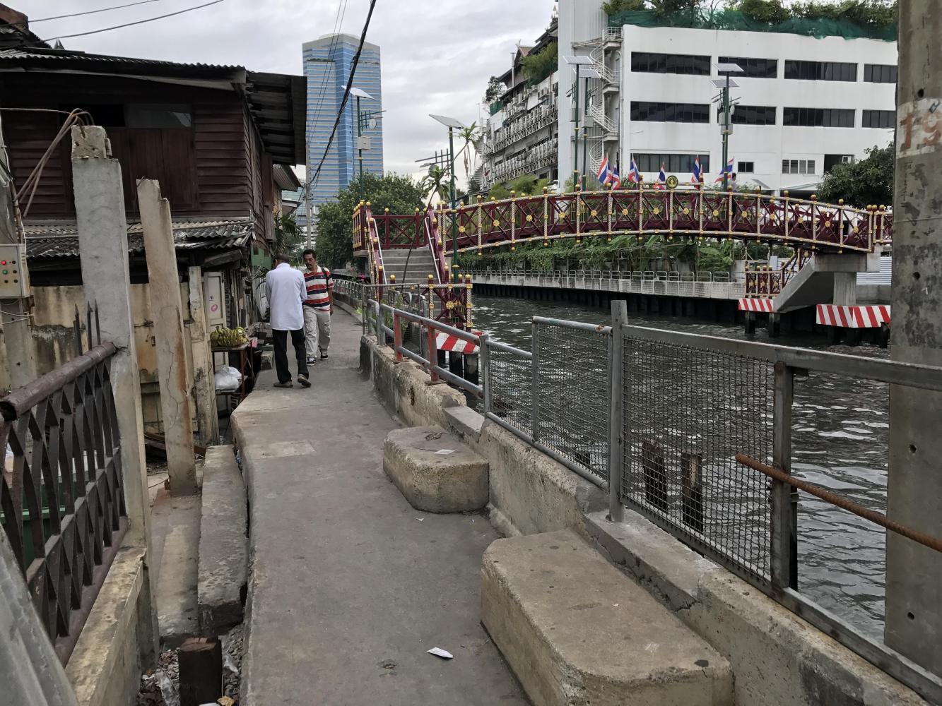 Starting on Sukhumvit 63 northbound, we then turned onto a frontage road, then onto a “cycling path” next to a klong (canal), which had a few unexpected obstacles but not insurmountable ones, and so on. There was no way to avoid a few busy roads but those were mercifully short-lived. At one point we were in a quiet, rather ritzy neighborhood, and suddenly started seeing soldiers with machine guns on corners. Wow, we were on an army base! Soldiers on guard duty have pretty boring jobs, they tried not to look interested in us but I think we were a welcome distraction. We smile and do our best to look harmless, if not hapless.