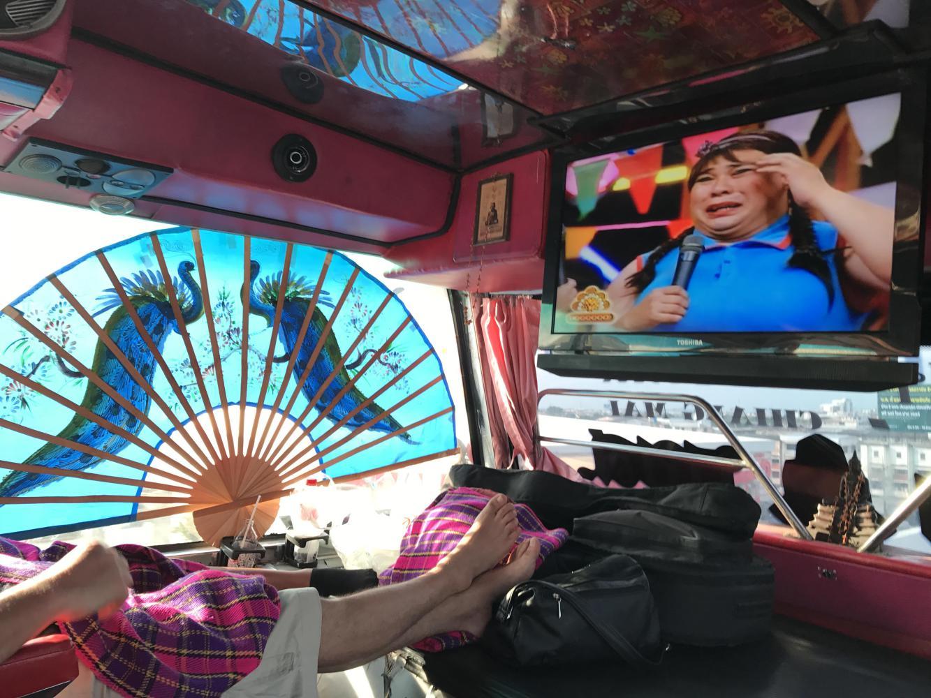 There was a toilet on our bus which I managed to avoid using. They put the four foreigners up front with the very loud television but turned it off after an hour of us putting our fingers in our ears as obviously as we could. Thai bus television is horrid, the worst, stupidest variety shows with completely obnoxious sound effects and canned laughter you can imagine. Torture.