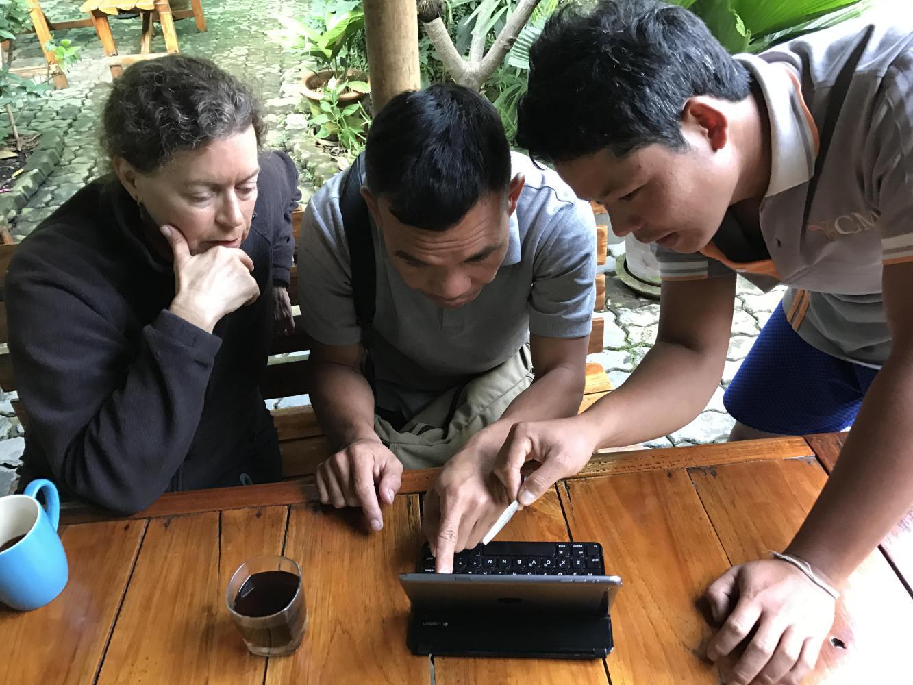 Finally we saw a restaurant opening and we could stop and eat some jok, rice porridge, and drink some fake orange juice. We lingered as long as we politely could and then found a guesthouse that had a room for us if we wanted to wait for it to be vacated and cleaned. This guesthouse does trekking tours and the tour guides were hanging around waiting to go out so we had a good time with them looking at Google satellite views of their Karen villages. They had done well for themselves and had working farms they lived at during the rainy season, homes they had built for their parents, children going to school. They were great guys, and very funny and lively.