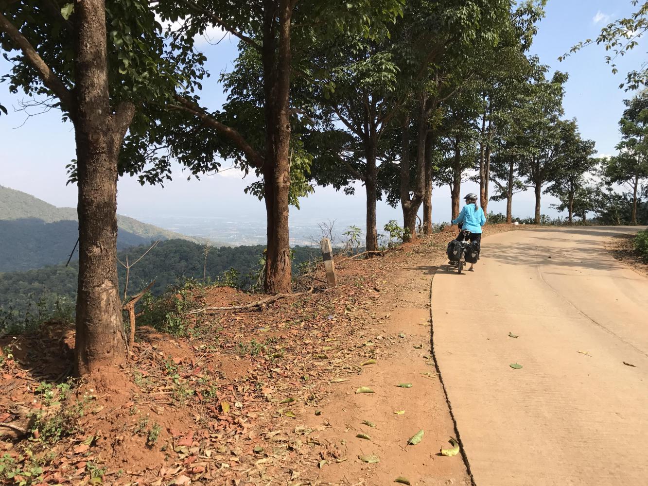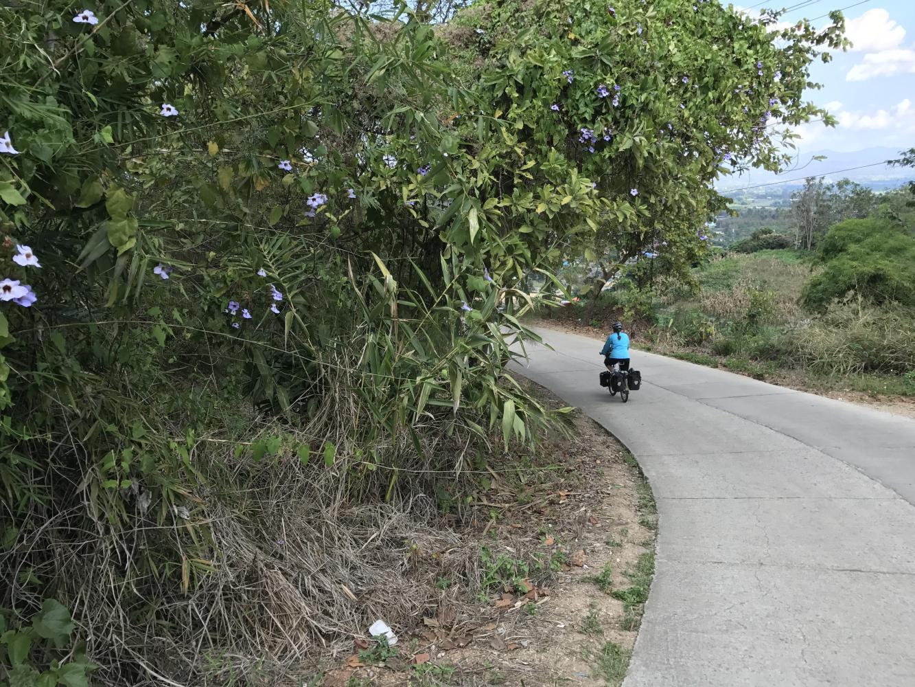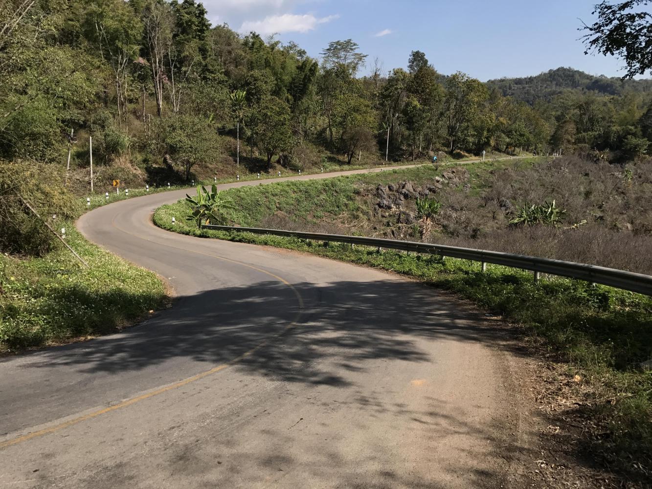 We four ate our third meal at the same restaurant. Across the street we took a look at the still well-stocked fireworks store and then were off on our climb. The road (1340) was beautiful, the day was beautiful and it was fun traveling with Chris and Coleen. I don’t know if they were holding back for us but it was fun ambling down the road together. We all knew we wouldn’t be together for long because they were heading up to Doi Ang Khang and we were going to take a right at some point and go mostly down (hopefully) and end up the day in Chai Prakan back on the main road (107) which we had left back in Chiang Dao. Chris and Coleen were taking a much harder uphill route. I think Chris had been on that road before. I had only seen it on maps and I knew it was too much for us.
