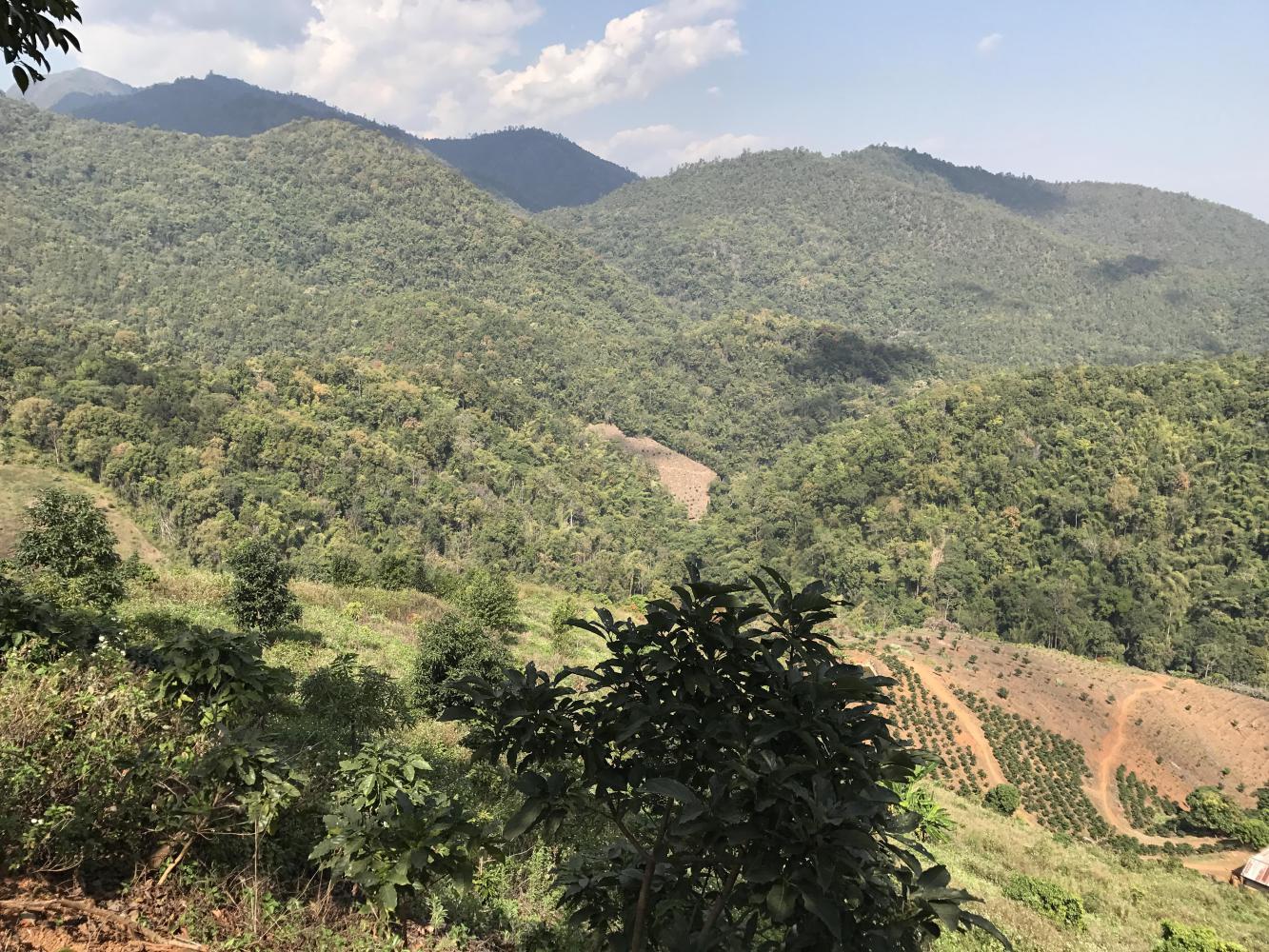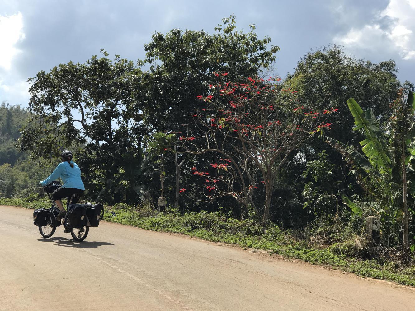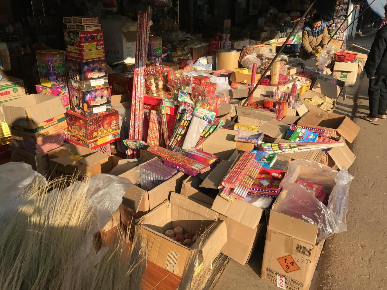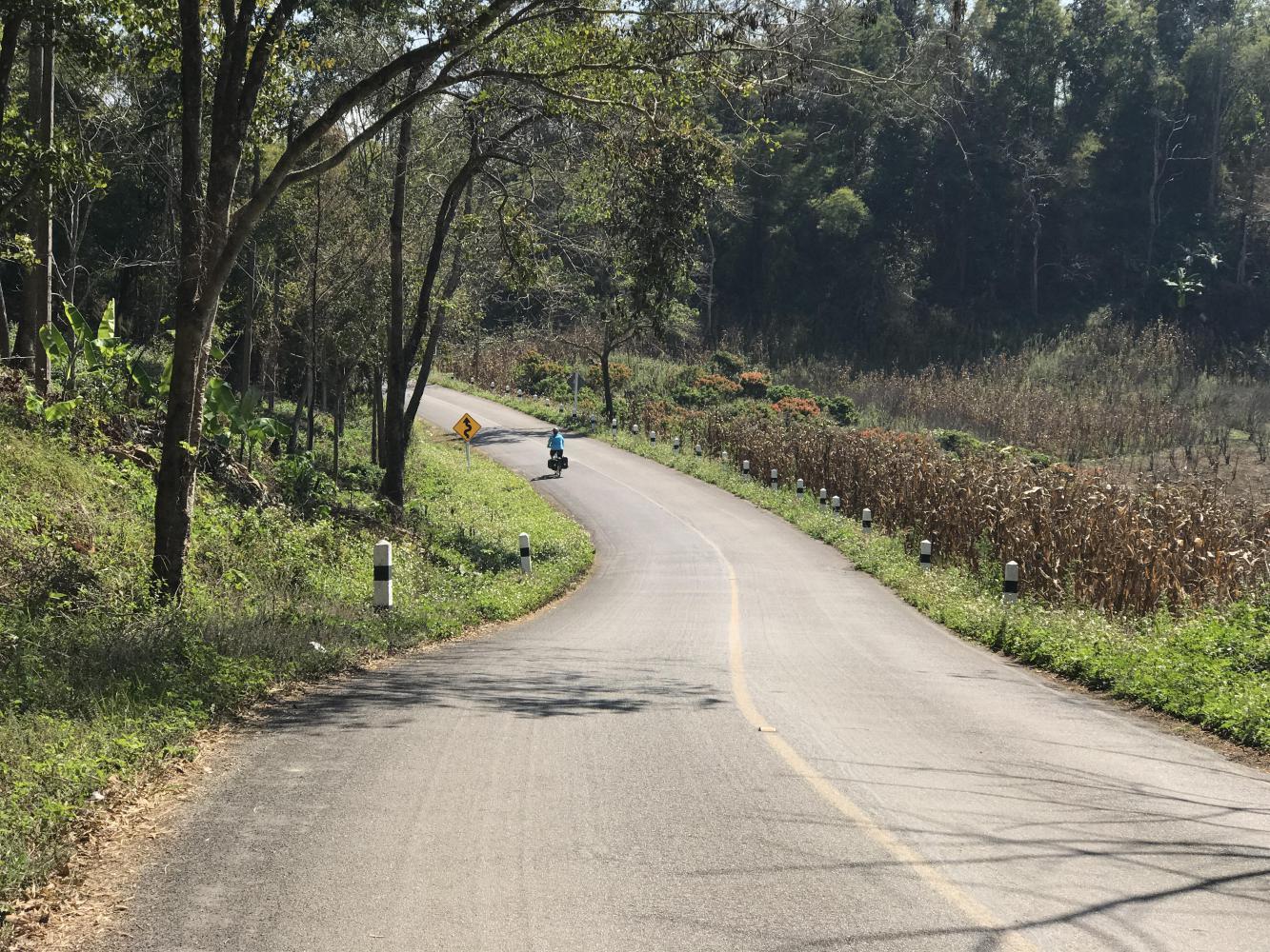 We four ate our third meal at the same restaurant. Across the street we took a look at the still well-stocked fireworks store and then were off on our climb. The road (1340) was beautiful, the day was beautiful and it was fun traveling with Chris and Coleen. I don’t know if they were holding back for us but it was fun ambling down the road together. We all knew we wouldn’t be together for long because they were heading up to Doi Ang Khang and we were going to take a right at some point and go mostly down (hopefully) and end up the day in Chai Prakan back on the main road (107) which we had left back in Chiang Dao. Chris and Coleen were taking a much harder uphill route. I think Chris had been on that road before. I had only seen it on maps and I knew it was too much for us.