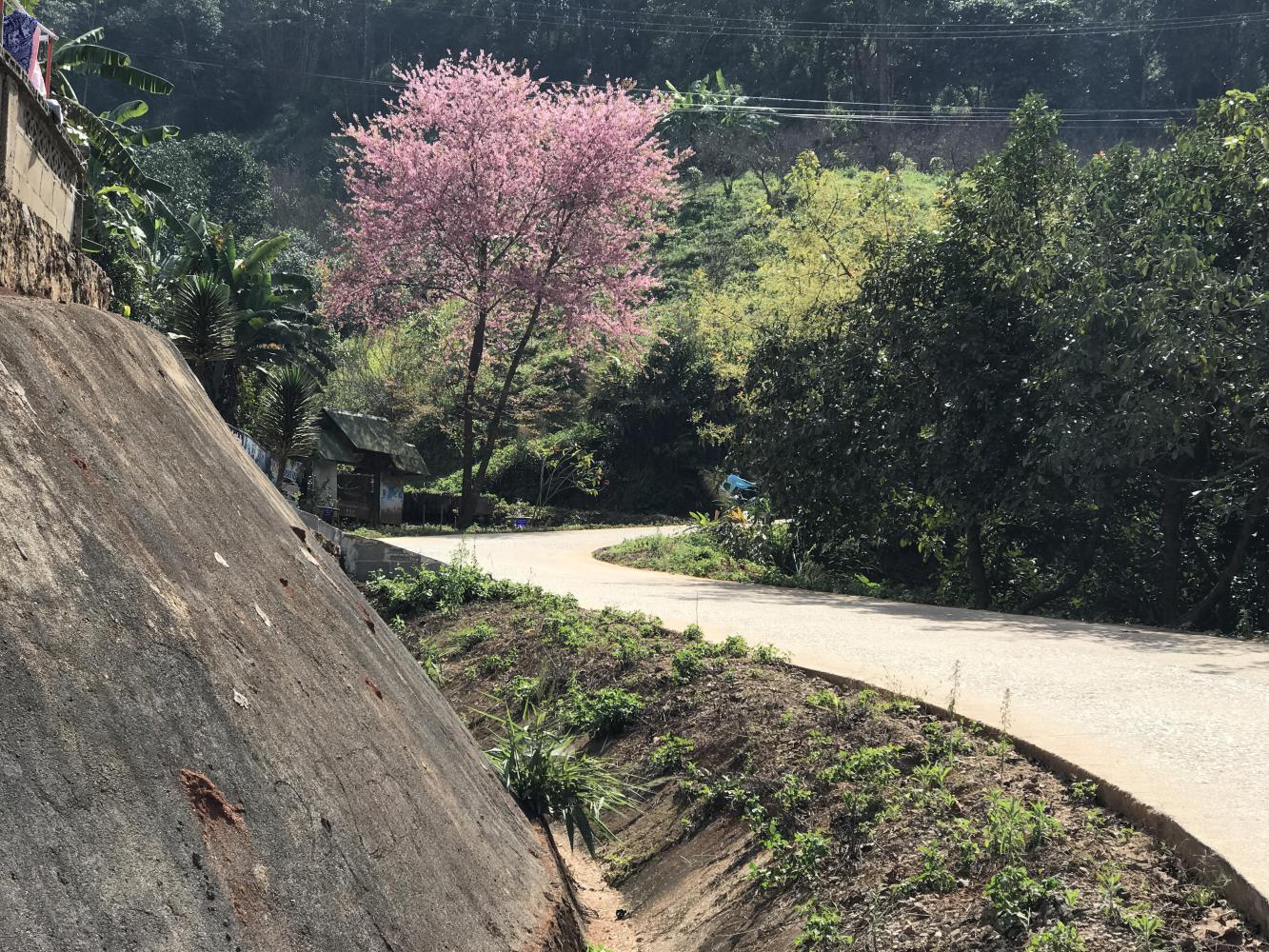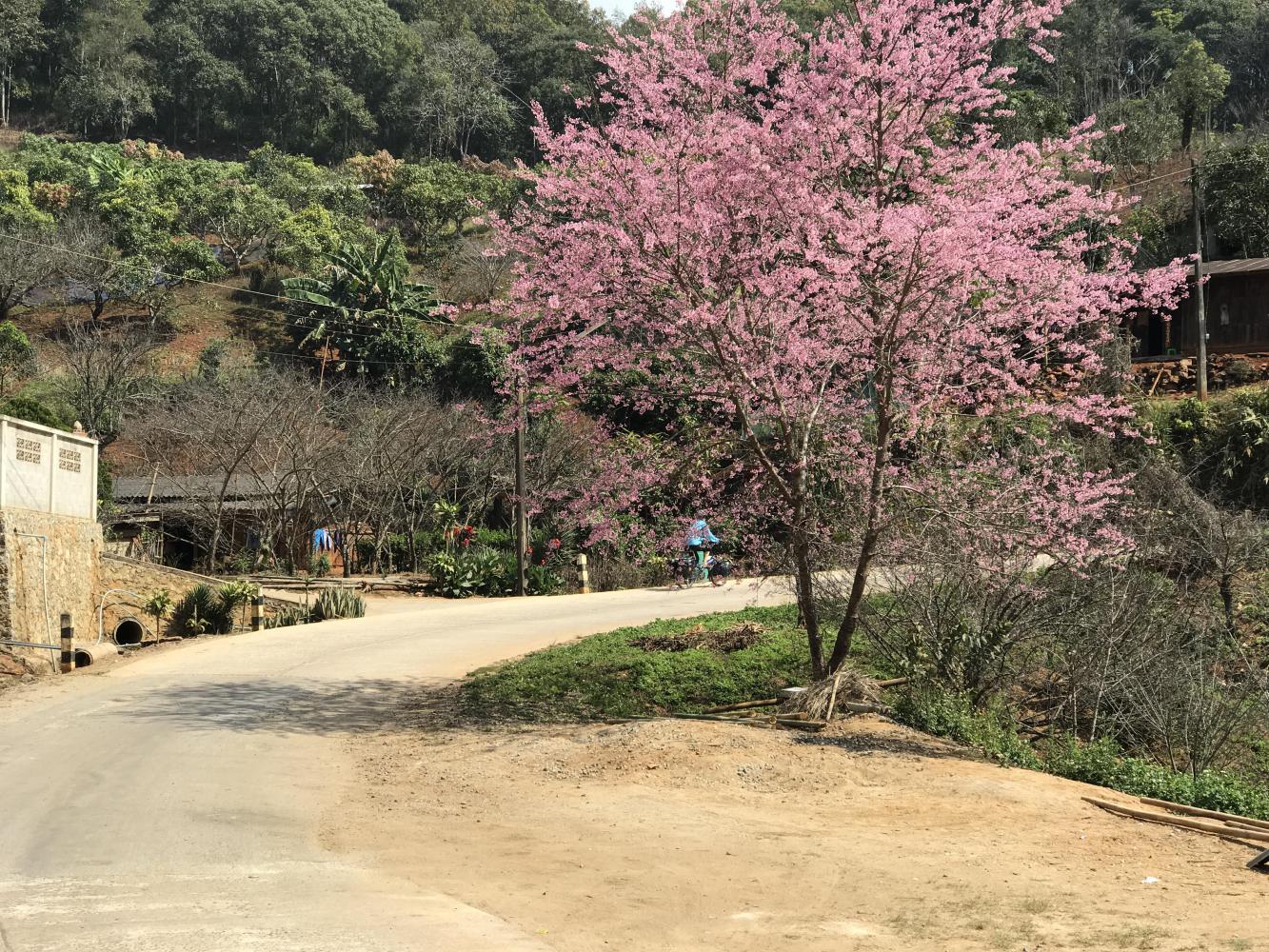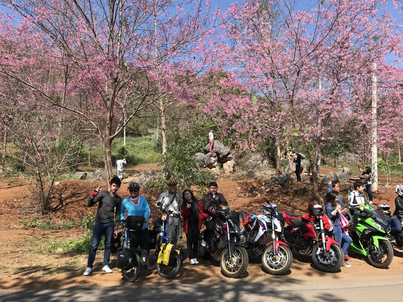 Chris and Coleen did finally move ahead of us, out of sight, largely because we came upon a hairpin turn with a lot of pink blooming cherry trees that needed to be photographed. It looked just like spring time and we had to stop. A large group of young Thai motorcyclists had arrived before us and positioned all of their bikes in a row in front of the trees - a perfect spring photo op. We let them take a bunch of group photos and then we positioned our bikes at the end of their line of bikes for more photos. I didn’t get the impression they were thrilled that we were horning in on their party but Thai congeniality prevailed for us, the weird foreigners.
