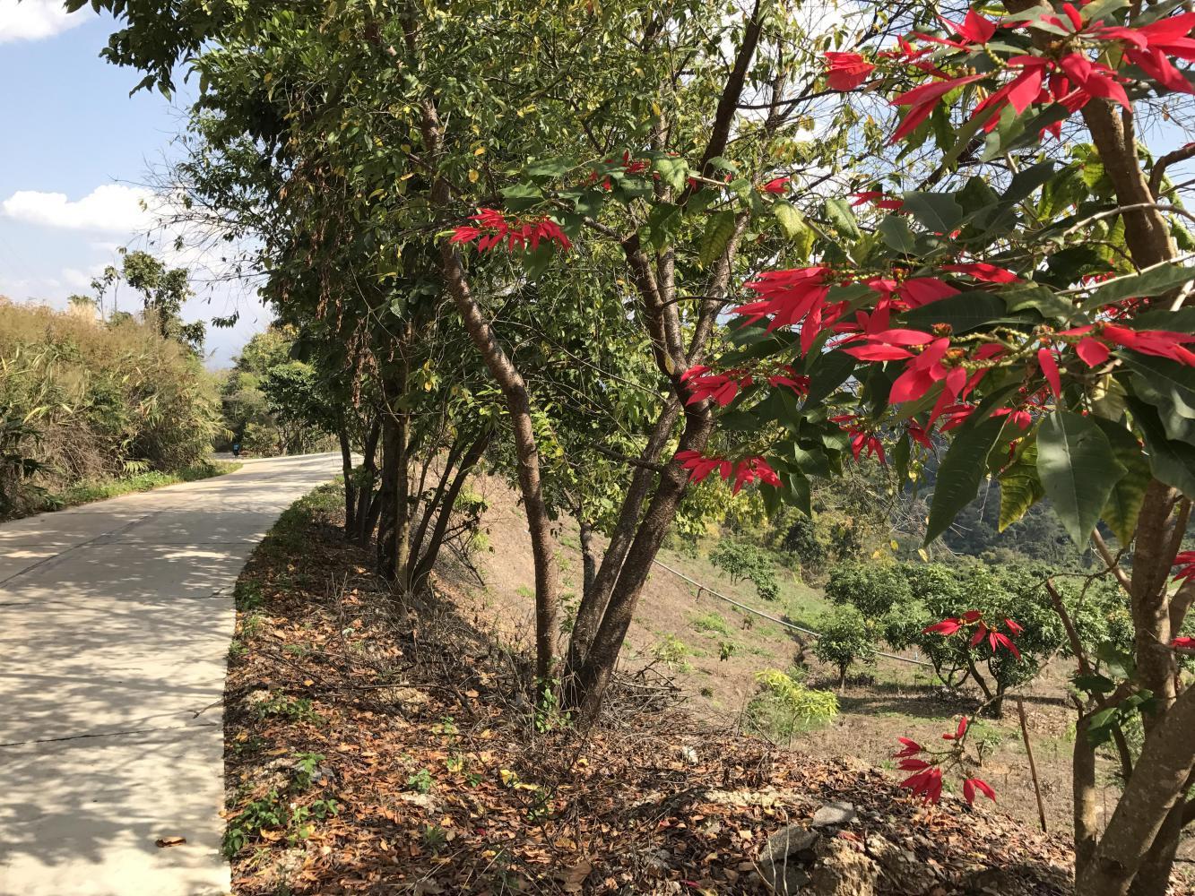 Our way followed a wonderful ridge for some time and then undulated but not quite as steep as had been. There were short stretches of steep hills and then we were treated to an amazing view of the mountains. Wild poinsettias lined the road and blazed brilliant red in the late afternoon sunlight.