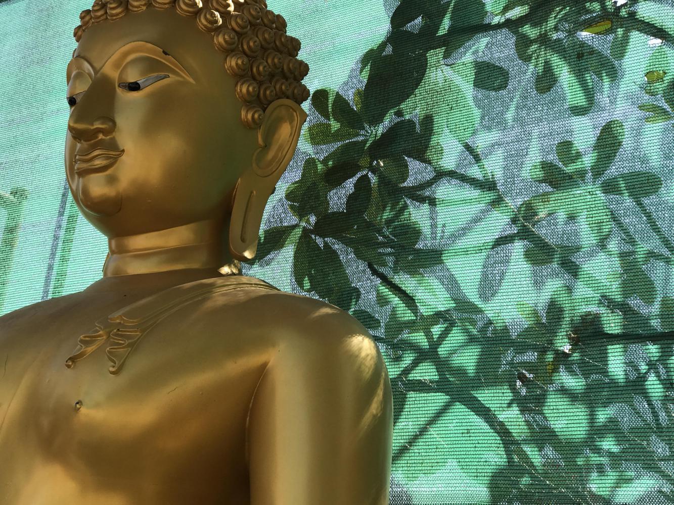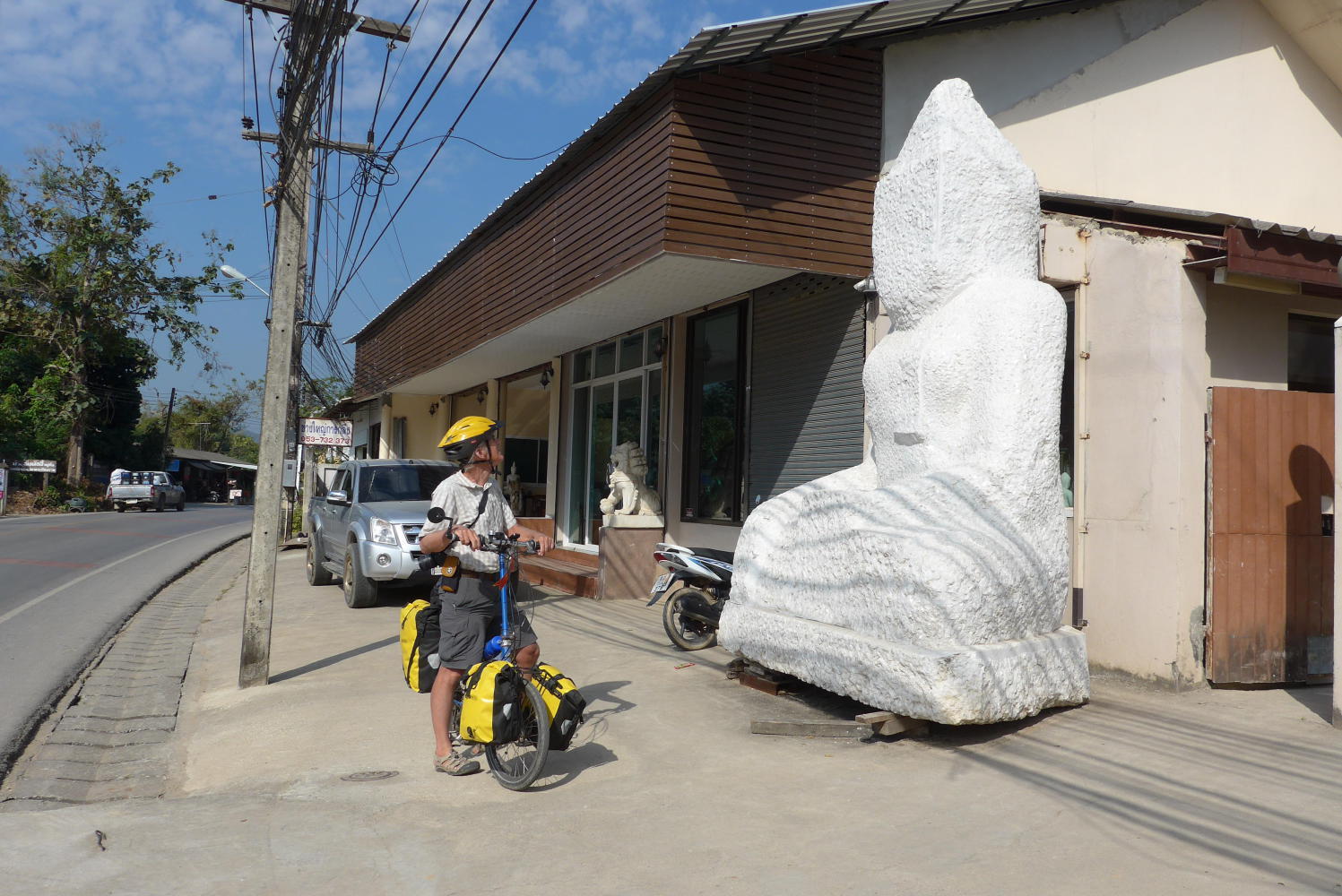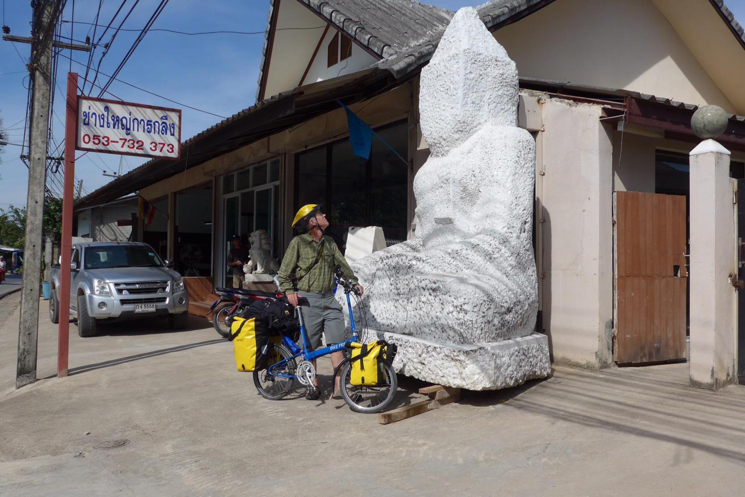 Leaving Mae Sai, I had my eyes peeled for something. For somebody who can barely remember her own middle name I did know that two years ago on the outskirts of Mae Sai we had stopped and taken a photo of Bruce in front of a… where was it, here? Here? I knew we were getting close and I slowed down and then called to Bruce, “THERE IT IS!” The huge unfinished faceless granite Buddha still sat patiently next to the sculpture factory gate, presumably waiting for the second installment payment to get his facial features done. It’s one of my favorite Buddhas, the unfinished mudra representing non-attachment to appearance, completion, payment, so many things. The granite twinkles merrily in its natural state. I took another photo of Bruce and maybe I’ll figure out how to show both photos in this journal but for now I remain unattached to that idea. (Edit: Yay!)