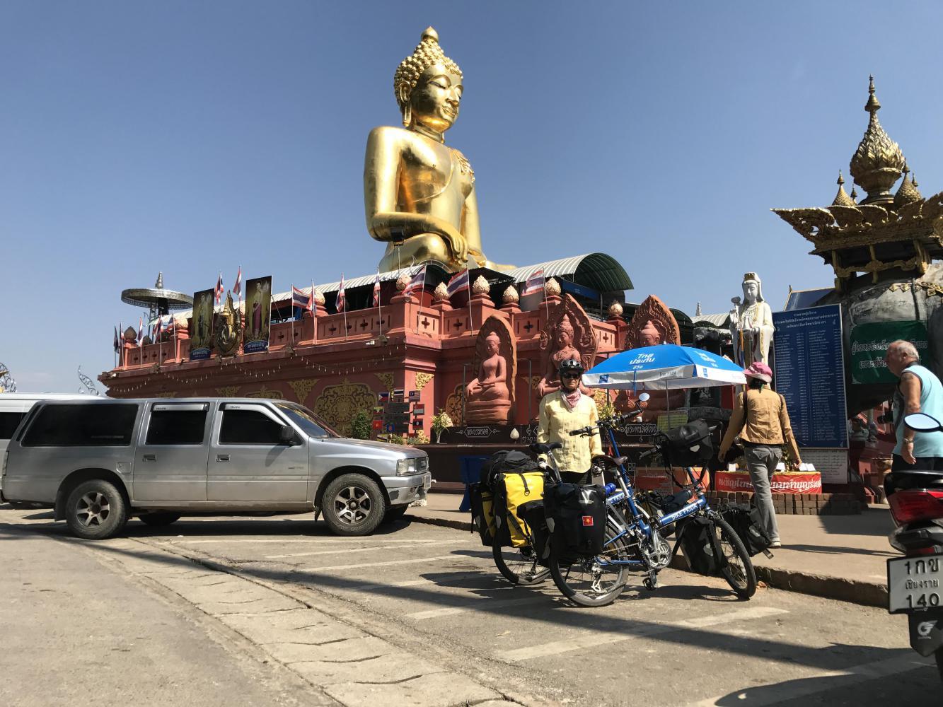 The ice cream stop is very near the Golden Triangle, a tourist stop that is busier than ever with a thousand huge tour buses and new hotels going up and an enormous golden Buddha simpering over it all. We stopped for less than five minutes and then got the hell out of there. I don’t think we would have stopped at all except that we get kind of emotional when we see the Mekong again. To think, we had last seen it down in the delta area of Vietnam when it was divided up into dozens of enormous branches of water rolling through the coconut groves ready to enter the sea. Here we were way upstream and it was running clear and mellow. We have seen so many miles of this river and have loved every bit of it, we hope someday to visit its headwaters up in the Himalayas. But not by bike.