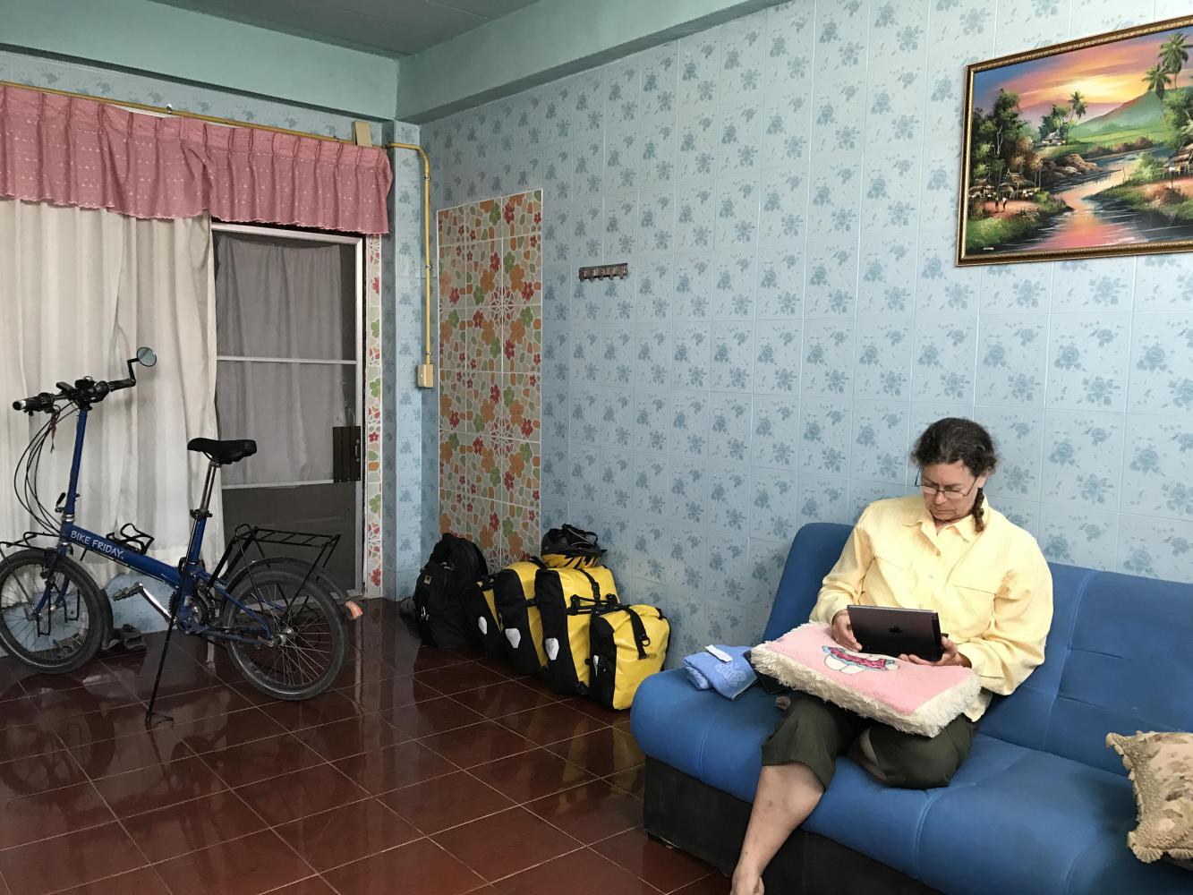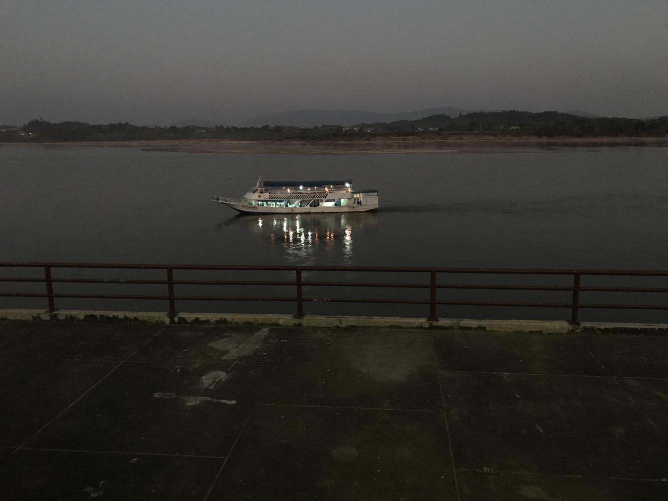 The last bit of road into Chiang Saen is easy and pleasant and suddenly we were there and homing into the same guesthouse as last time. It’s cheap, funky, but the room is large with plenty of room for our bikes and they both got a little shower with the butt wand. Then it was on to scout out lunch at a little place downtown, return to our room for a nap, then stumble back out to the riverfront where small tables are set up on mats.