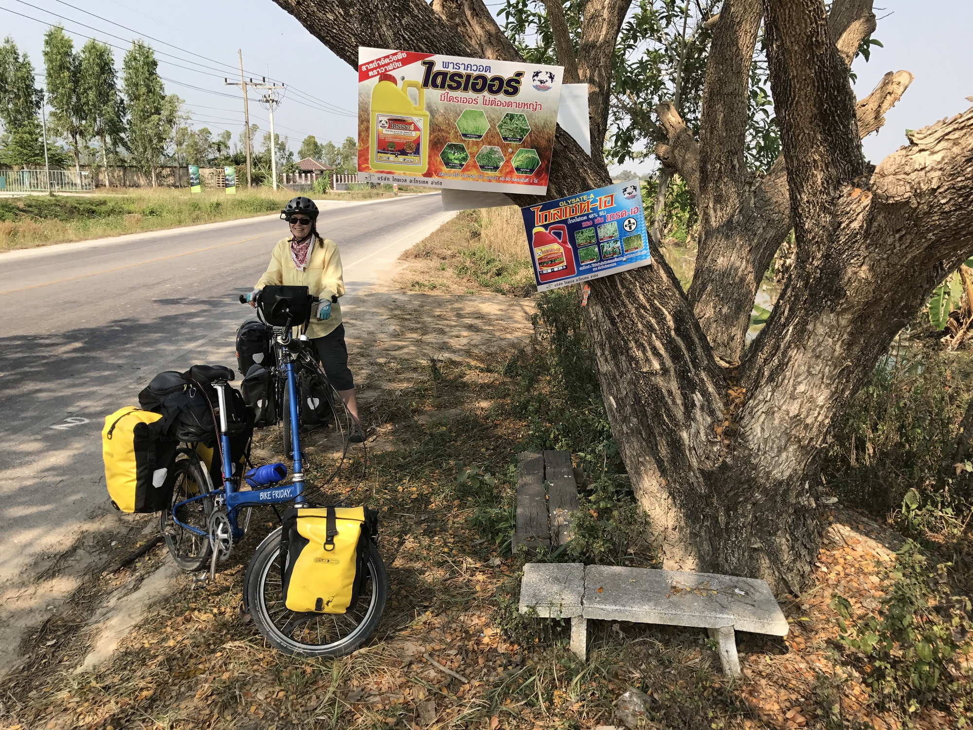 The road continued on, sweet, quiet, mellow, with a stupid but not terrible wind. On a long straight stretch we encountered two gregarious Aussie cyclists and we all traded tales of the road as the occasional Toyota HiLux roared by. As we chatted, yet another bike rolled up, this was an American who lives a few miles away, out for his daily ride. We later spotted his beautiful house surrounded by palm trees, he has an interesting website called Village Farang that is very insightful if you have ever wondered about Westerners’ experience living permanently in Thailand.