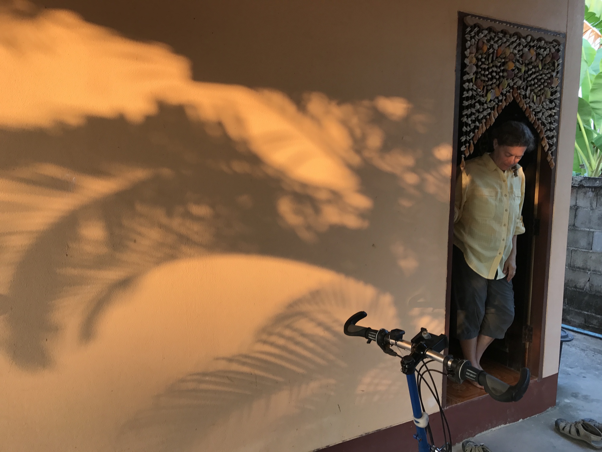 Our lazy asses were beat and it was off to the shell-adorned love hotel. But first we looked up the word for papaya and asked Mae and Pa about buying one somewhere. Pa looked concerned because the market had already closed, but after a quick exchange with Mae he trotted into the back and returned with two small papayas. We demurred, reluctant to take their breakfast, but he waved us off and insisted. I don’t know, these small generosities spark something in me. He was probably saying that they would hit the market up in the morning and find more, his neighbor grows them, there will be an endless supply tomorrow, no problem, no problem, we don’t know. Maybe it’s because I am tired that the papayas make my eyes well up a little. That must be it.