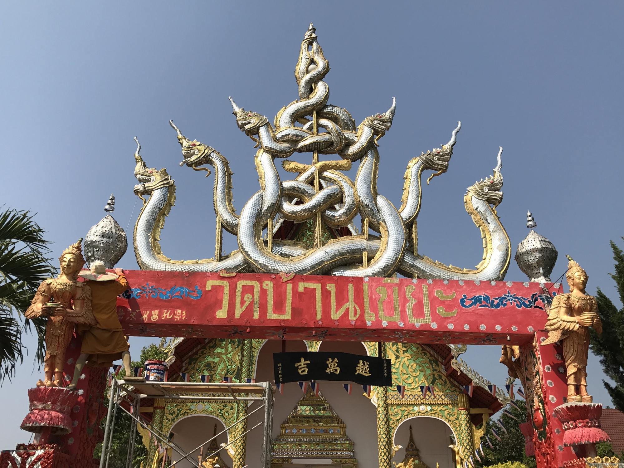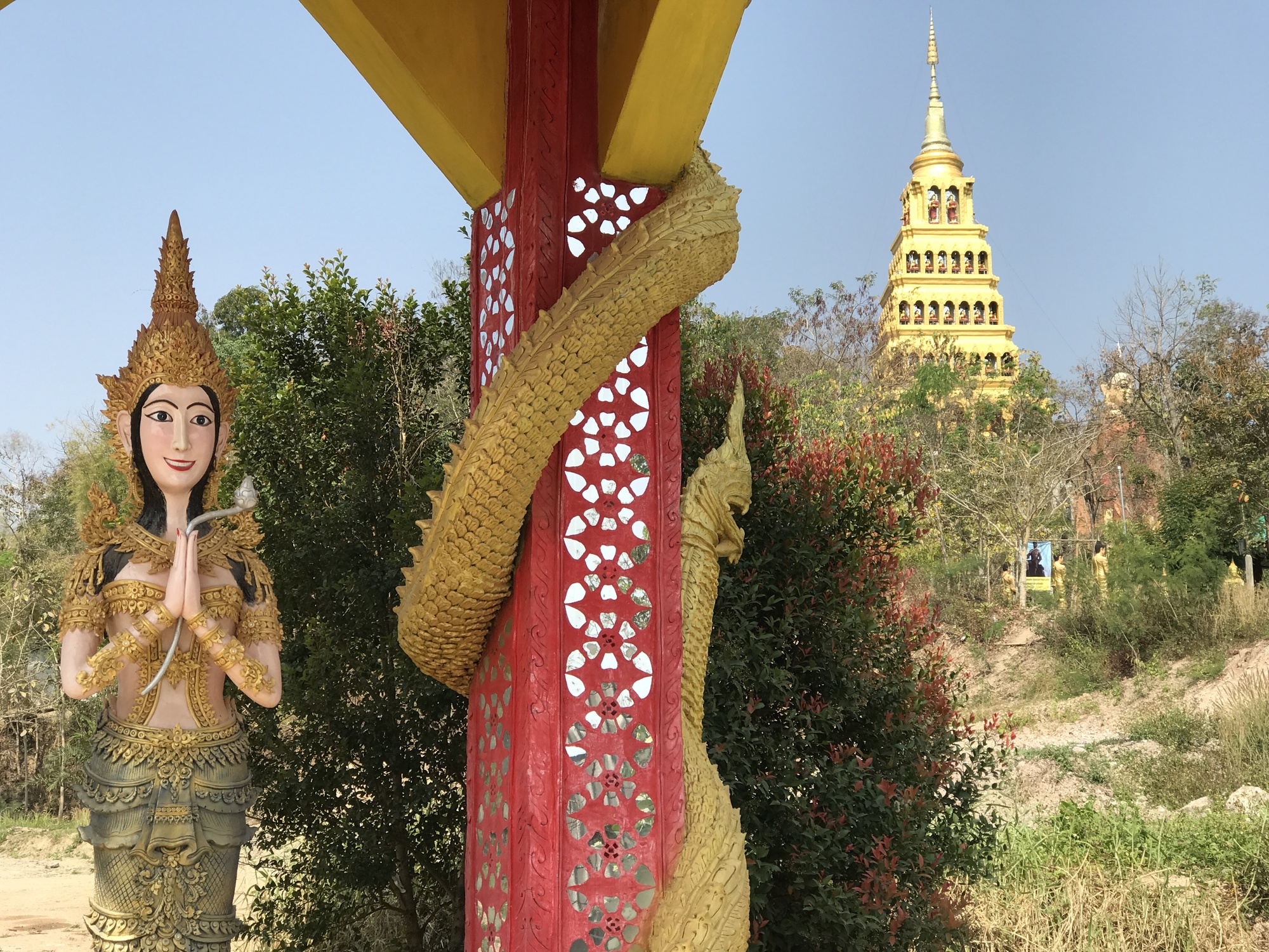I’m not the only person who experiences temple fatigue in Thailand, almost all of them are colorful, many have enticing shady temple grounds, they are good stops for finding a row of toilets or to cool off, maybe have a look at their interiors or nod to friendly, dignified monks. But there are so many of them! You can’t stop at them all! But occasionally you spot a particularly gaudy temple and if it’s on a hill, you watch it get closer and you know what goes through my mind?