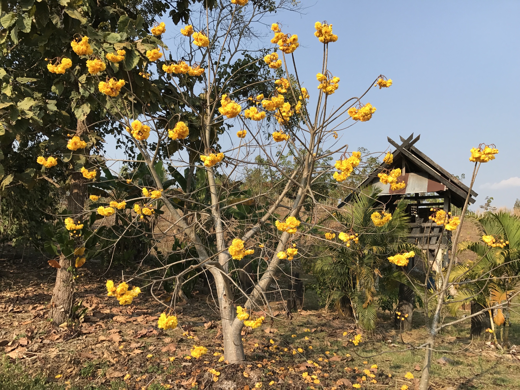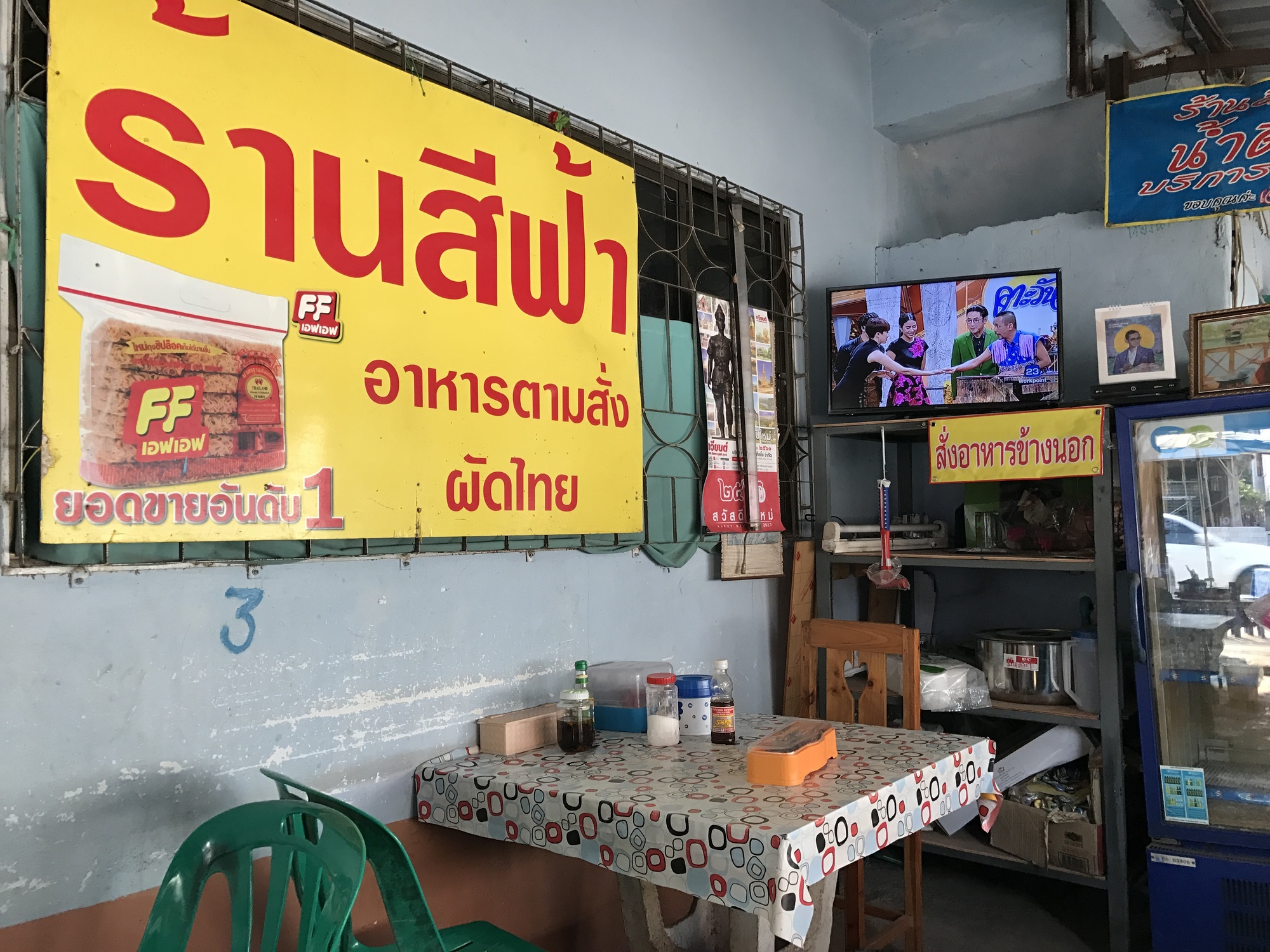 We asked about food and the guesthouse owners made gestures toward town and “turn left”. First we had a lookaround for tomorrow’s papaya but had no luck, and then stopped at a humble restaurant where Mae and Pa were cooking up a storm at the front for takeaway customers, but they showed us to a table and gamely took our orders. The name of this restaurant, using Google Translate, is “Blue Restaurant à la Carte” so if you’re ever in Mengrai, look them up. Our food was terrific and our hosts genial and kind.