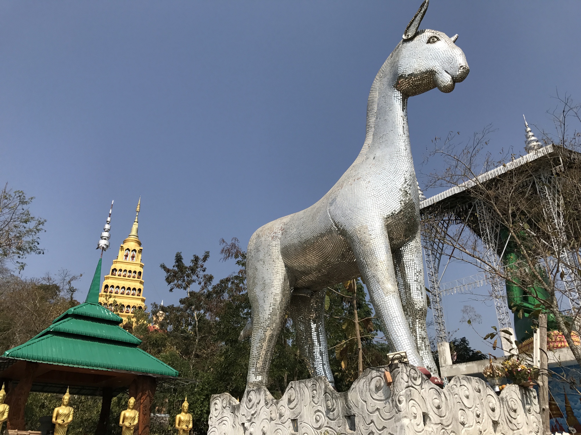 Nope. It was beastly hot by this time and at that point all I wanted to do is keep riding, let that wind blow through my shirt and dry the sweat off of my face, get to where I’m going, where the beer and the air conditioning play. But I am riding with a photographer, a guy who documents no matter how tired or hot he is, and it’s a good thing, too, or I wouldn’t remember anything about anything that happened or what we saw. I dug in my heels about going up the hill to the temple itself, and why should we? The lower grounds were a zoo of fanciful mirror tile animal statues, freshly painted Buddhas lined up like the king’s army, and most importantly, a little shade for me to stop and drink some water. After my thirst and resentment were quenched I was able to admire the adorable mirrored horse that posed in a most droll, sparkly way. See, on my own? I would have missed that.