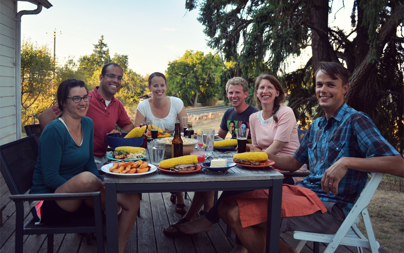 Within an hour we've met Ben's wife Catherine, their friends Joel and Carrie and Joe, and the three dogs who call their farmhouse home. Soon we sit down on the deck with everyone to enjoy a dinner of pork chops (sourced from one of the pigs they raised), sweet corn, cole slaw, tomatoes in shades of yellow and orange and red, and cold bottles of beer. We learn how most of the people seated around the table grew up in the area, have known each other since before high school, and have keen interests in things like organic farming, backcountry cycling, canoeing down rivers, and taking classes on permaculture at the university.