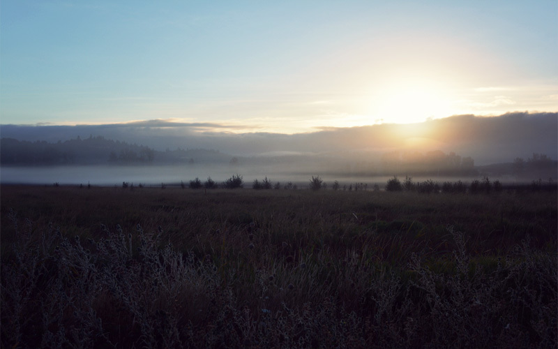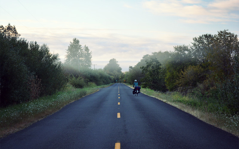 We wake in the dark at 4:45, start to pack at 5:15, and return to the road by 6:00 with the sky to the east just beginning to brighten and all of our lights glowing again. The air sits so still that the thinnest clouds of fog hang motionless a hundred feet above the valley floor. The cold and the wet of the world wrap themselves around us. Beads of condensation form up and down the exposed parts of my arm.