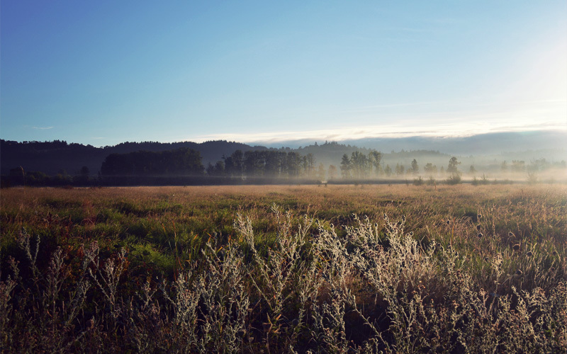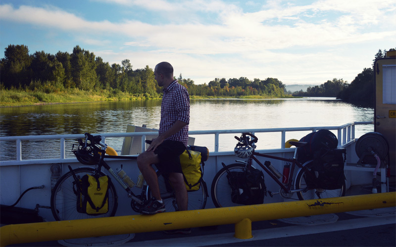 Our path takes us alongside wetlands and through a wildlife preserve, where tiny songbirds eat blackberries, egrets call out before we can spot them, and at least half a dozen other types of birds chirp and tweet unseen from the trees that line the creek. As the sun comes up above the hills, its brightness turns the floor of the valley into an ocean of shadows and contrast, with the branches and leaves and even individual blades of grass glowing in yellowish tones while standing in stark relief. When we reach the Willamette, we ride across on an otherwise empty ferry for a dollar each. One cable hangs a hundred feet above the river, another sits just below the water's surface, and together they pull the boat from one bank to the other. It all takes less than three minutes.