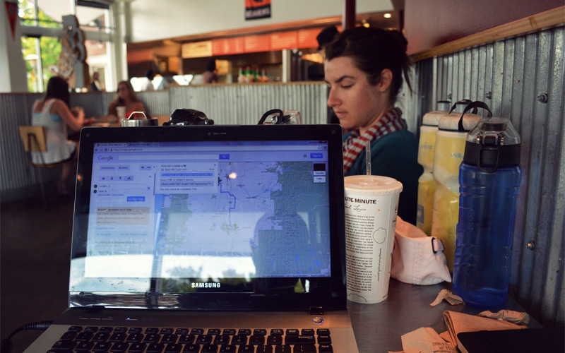 In Corvallis we ride right through the campus of Oregon State University. I can tell that this would be a good place to call home, based only on the fact that three people come up and talk to us about bicycle touring within the first half an hour we're in town. Chipotle becomes our office for the afternoon; we're there for so long that the entire work crew changes by the time we leave, and we gain two pounds each from soda refills alone.