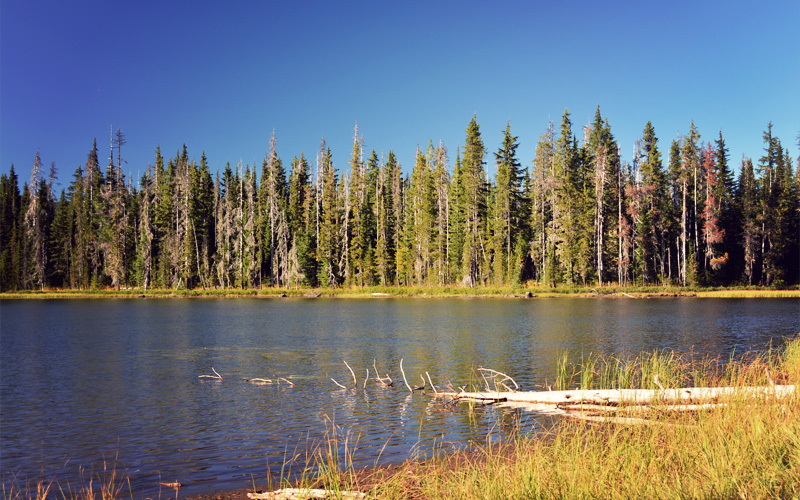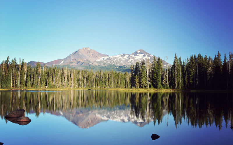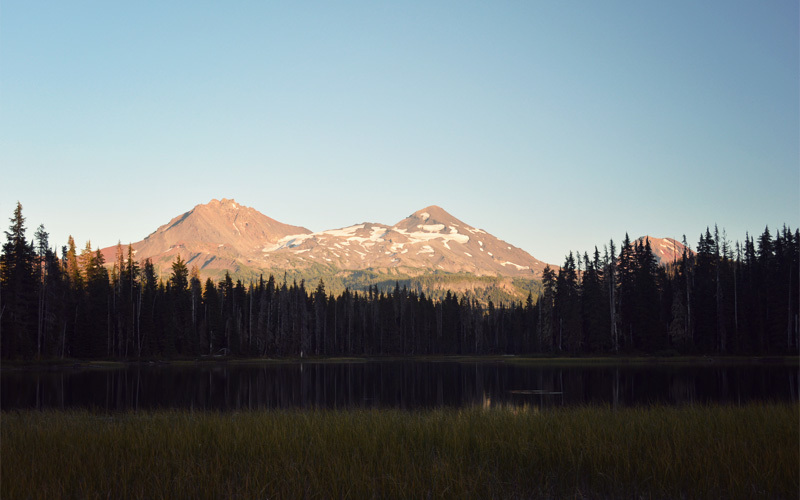 We feel even better when we reach Scott Lake. Standing at about 4,500 feet, we can see the majesty of the North, Middle, and South Sisters Mountains, both looking up into the sky and down into the reflection of the water. A soft skirt of grass and reeds line the water's edge, and above them we watch dragonflies catch bugs out of midair. Fish jump from below the surface in competition for the same bugs. Blue jays dart in and out of the tree tops, and everywhere there's the low hum of mosquitoes. But the manmade noises are absent. There are no cars, no motorcycles, no airplanes. It is clear and sharp and still. It is the definition of spectacular.