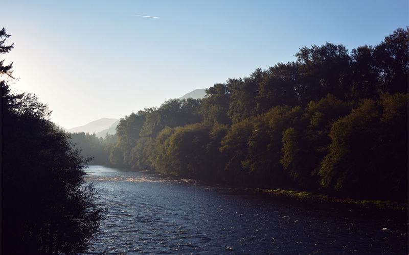 The morning is so cold that we can see our breath. We head east on the same highway as last night, but this time there's no traffic to speak of, and the shoulder's wide enough that we can ride side by side. The sun shines into the McKenzie River, revealing the shape and color of the rocks at the bottom. It also filters in rays through the branches of the evergreens that line both sides of the road.
