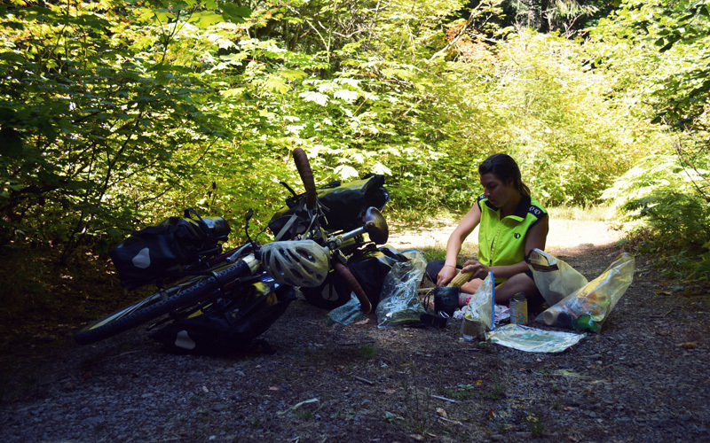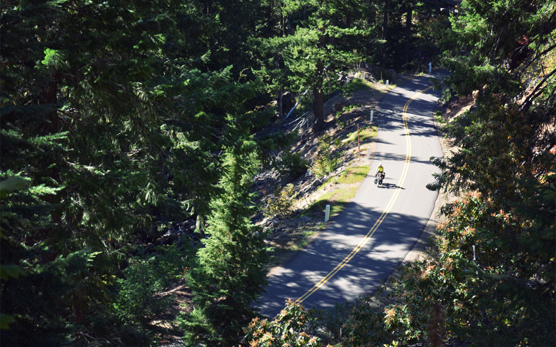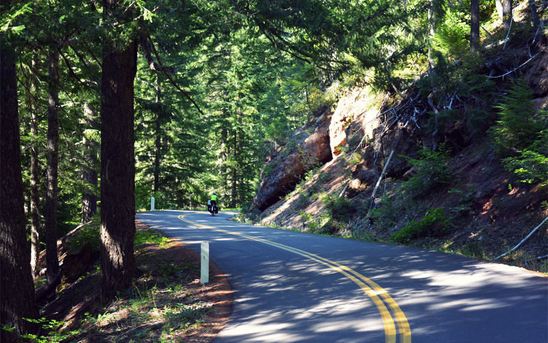I keep expecting the trees to thin out as we climb up past 3,000 feet, but they don't. That means we ride under clear and sunny skies but almost everything we see when we look in front of us is some shade of green or brown. Kristen starts to wear down the farther we go, the result of six straight days of riding and a climb that never levels, not even for a quarter of a mile. The farther we go, the turns become tighter and the road starts to bend at such angles that it almost folds over on itself. To keep our focus away from slow speeds and sore legs, we tell jokes that aren't really funny, make up offensive scenarios involving drivers who pass too close, dream about pizza and an off day in Sisters on the other side of the mountain, have lurid fantasies about Cherry Coke and gross movie popcorn, and decide that Kristen will take testosterone and I will take estrogen so that our ability levels start to even out.